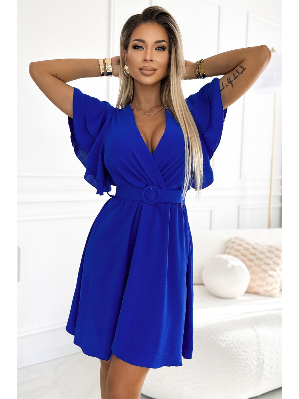 Jedinečná nabídka pro moderní ženy šaty, které spojují pohodlí a moderní elegantní design. Volné rukávy a volná sukně zaručují pohodlí při nošení, zatímco klopový výstřih dodává celku jemnou ženskost. Široký pás krásně zdůrazňuje pas a dodává siluetě smyslný výraz. Vyrobeno z křížené látky v intenzivní modré barvě. Šaty značky numoco basic jsou zárukou stylu. Evropský produkt.