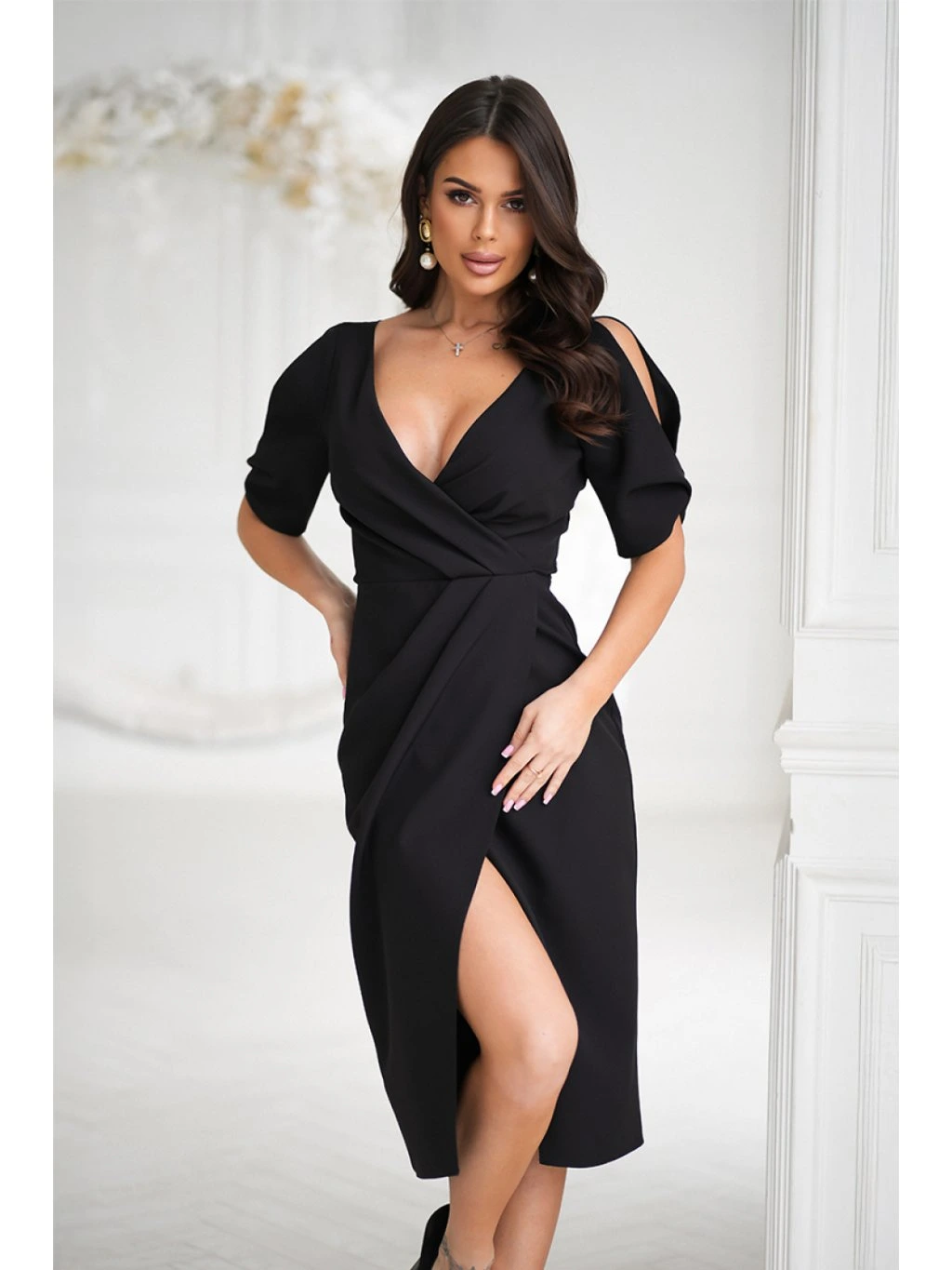 Elegantní a ženské šaty s přiléhavým střihem, ideální na elegantní příležitosti. Záhybový výstřih jemně zdůrazňuje poprsí a rozkročené rukávy přidávají lehkost a originalitu. Asymetrické záhyby zúžují postavu a rozparek vpředu zdůrazňuje nohy a zajišťuje pohodlí. Šaty se zapínají na skrytý zip. Dokonalá volba na svatby, rande a oficiální setkání!