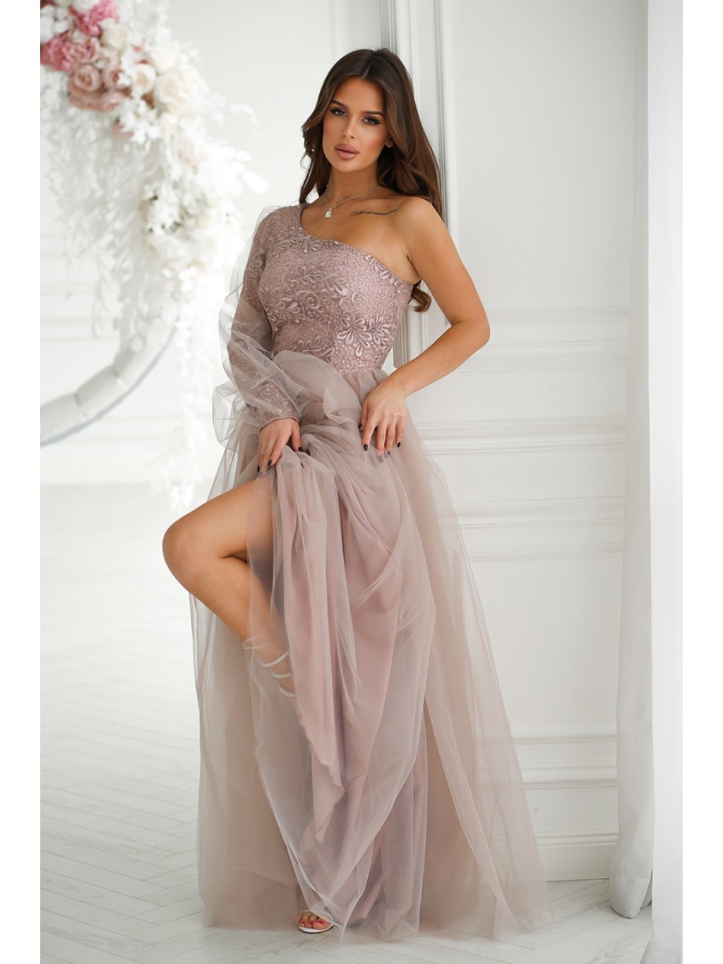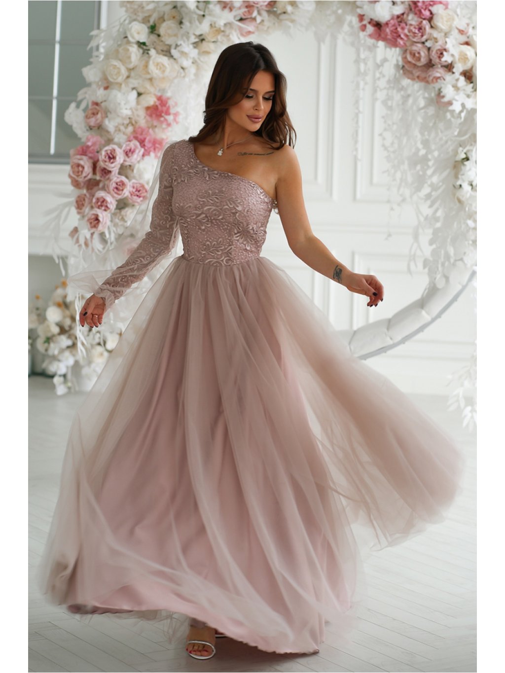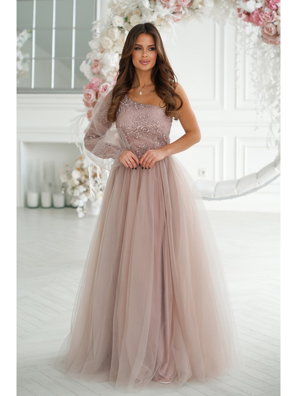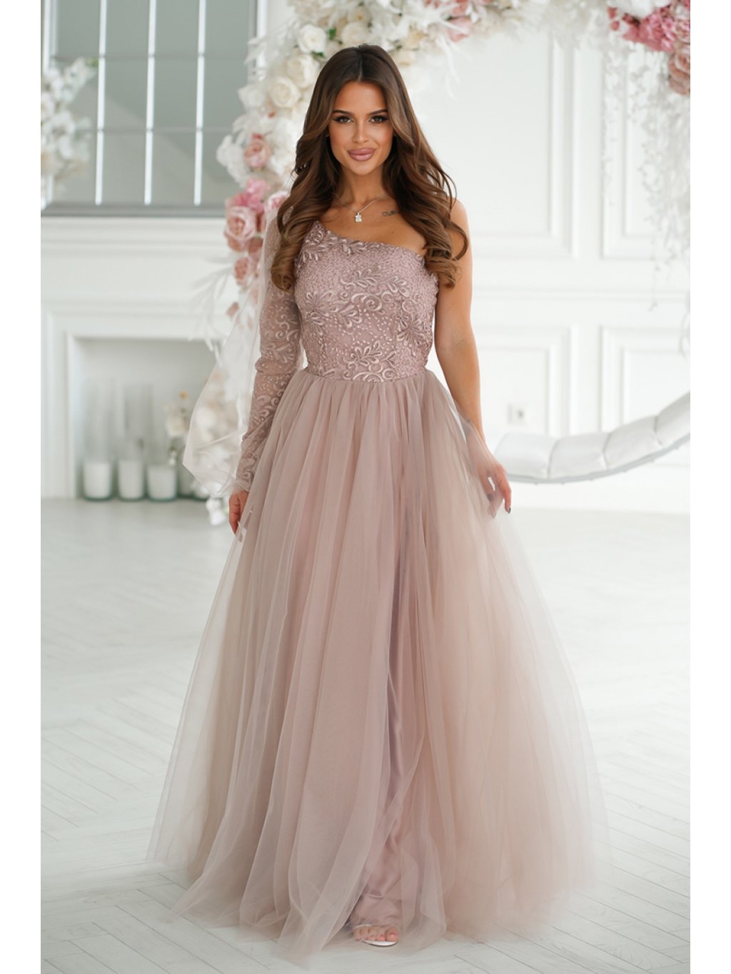 Fenomenální plesové šaty s rukávy na jedno rameno. Vrchní díl je pokrytý pěknou třpytivou krajkou a na rukávech je navíc zdobený minimalistickou síťovinou. Rozšířený spodní díl je pro větší objem šitý ve vrstvách s tužší síťovinou. Šaty mají skryté zapínání na zip a jsou podšité.