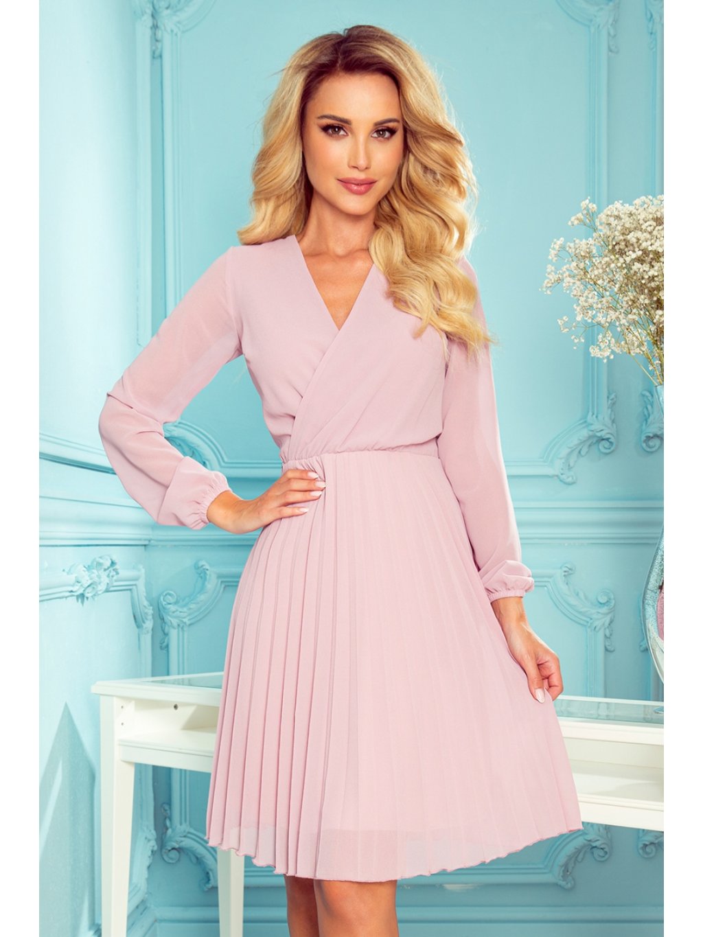 Plisované šifonové šaty s výstřihem a dlouhými rukávy. Šaty v pudrově růžové barvě. Značka numoco. Vyrobeno v Polsku.
