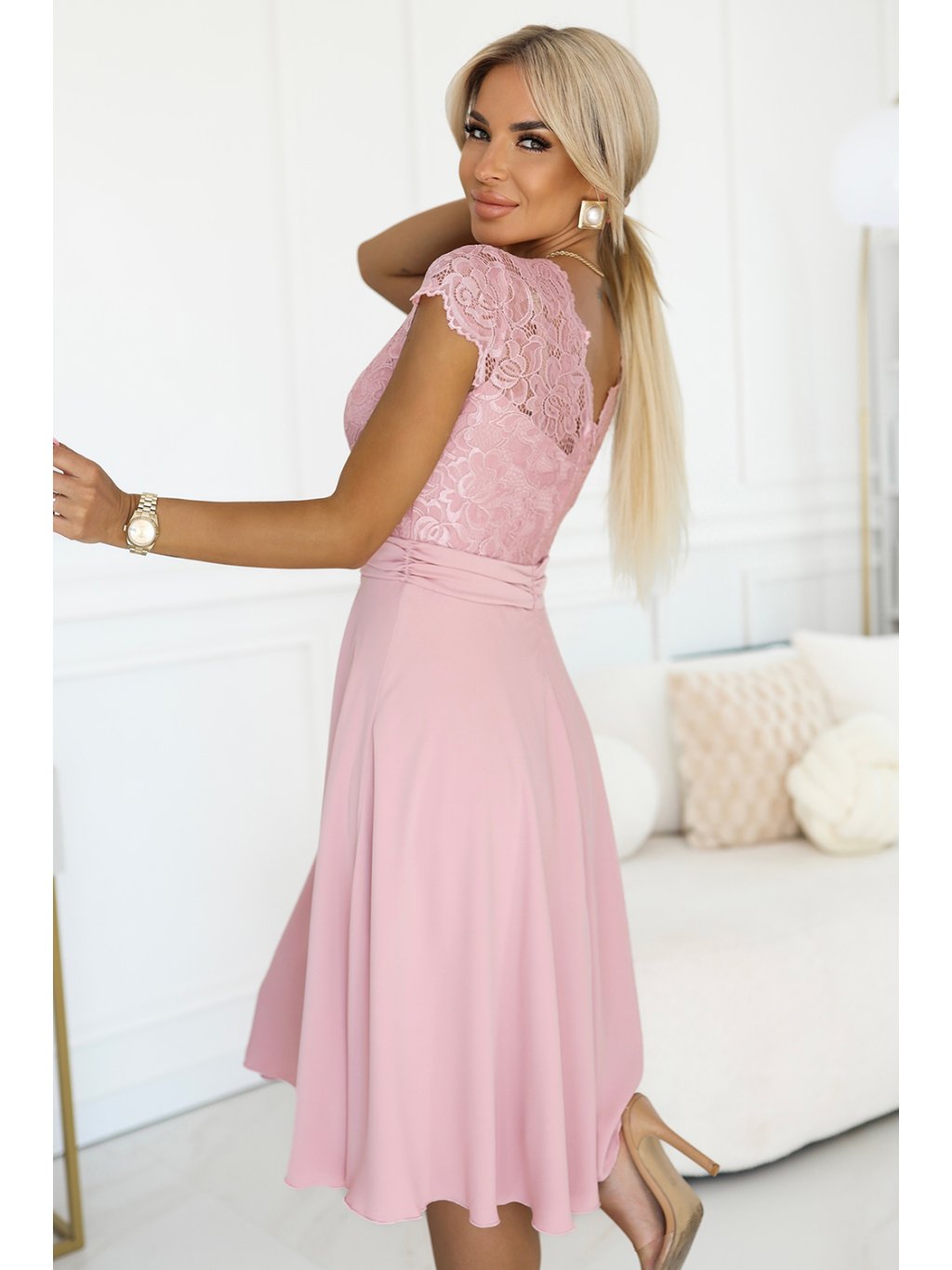 Společenské šaty růžové s krajkou ke kolenům 215906 Numoco