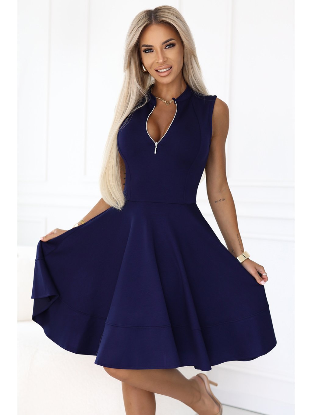Poznejte eleganci v moderním provedení! Tato úchvatná modročerná šaty s rozšířeným dnem a efektním zipem na výstřihu jsou ideální volbou pro ženy, které oceňují styl, ženskost a pohodlí. Přiléhavý vršek krásně zdůrazňuje pas, lehce rozšířené dno dodává lehkost a dělá šaty skvěle padnoucími v pohybu. Nastavitelný zip na výstřihu umožňuje přizpůsobit hloubku výstřihu podle příležitosti, můžete vsadit na decentní nebo odvážný vzhled. Jedná se o kreaci vhodnou na svatby, koktejlové večírky, romantická rande, elegantní večeře nebo pracovní schůzky, kde chcete vypadat stylově, ale s elegancí. Hluboká modrá je nadčasová barva, která skvěle ladí jak s jasnými, tak tmavými doplňky, s nimiž vytvoříte desítky stylizací! Polská výroba značka Numoco.