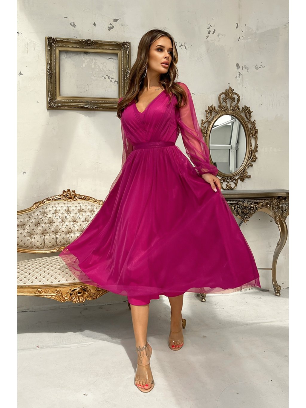 Midi šaty s mírně rozšířenou vrstvenou sukní zdobenou brokátovou síťovinou. Vrchní část kreace je nařasená s dlouhými rukávy zakončenými gumičkou. Rukávy jsou vyrobeny ze stejné síťoviny jako zbytek šatů. Výstřih a záda ze serpentin. Šaty se zapínají na krytý zip a mají podšívku. Model dodává šatům eleganci a ženskost.