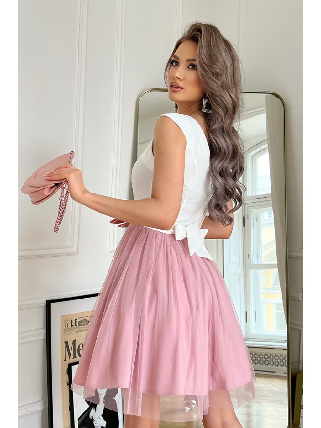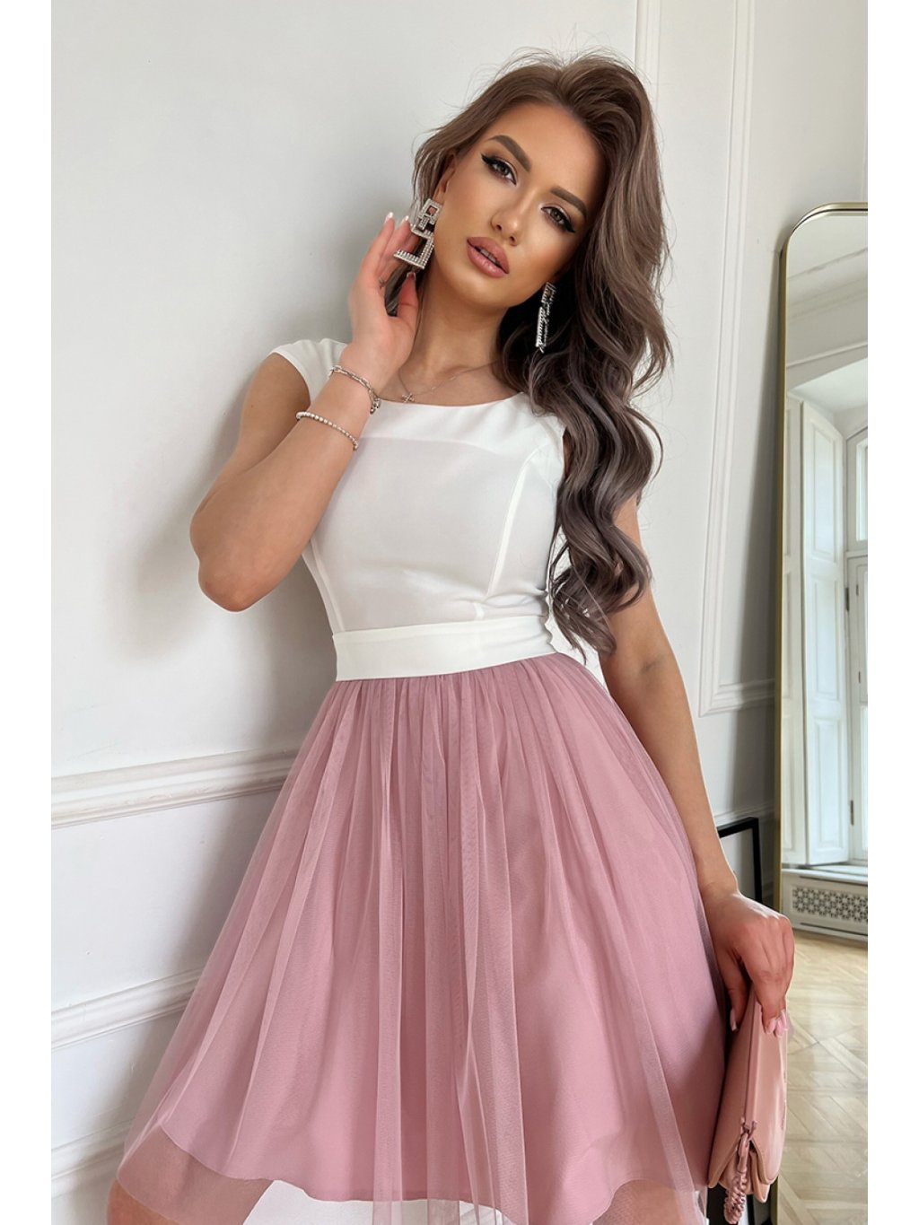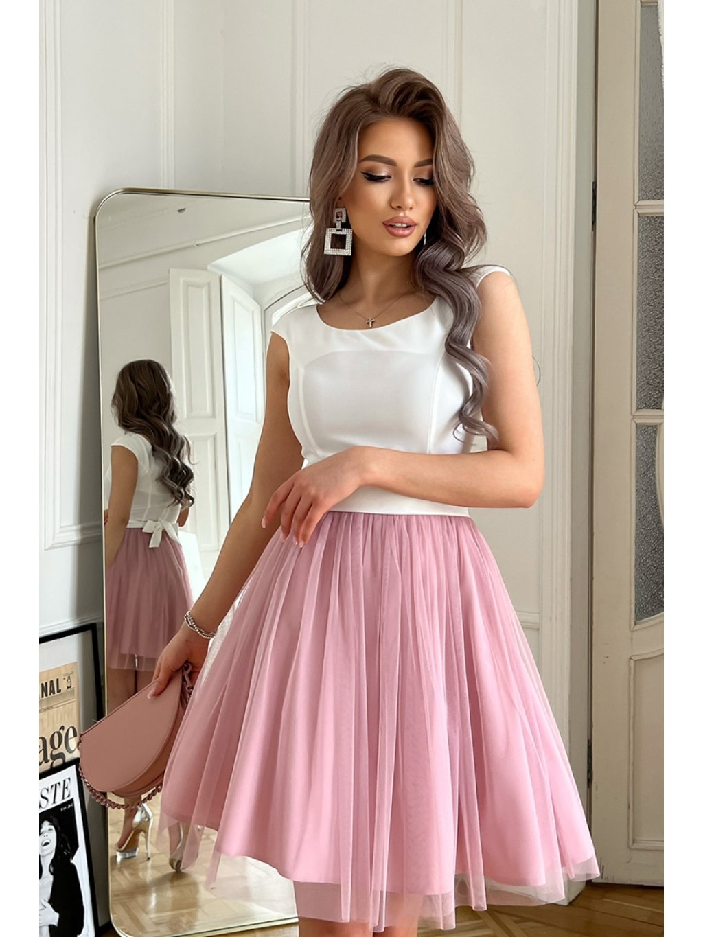 Šaty s vrstvenou tylovou sukní ušité v zajímavých barevných variantách. Hladký vypasovaný vršek, vzadu na zip. K modelu je připevněn pásek.