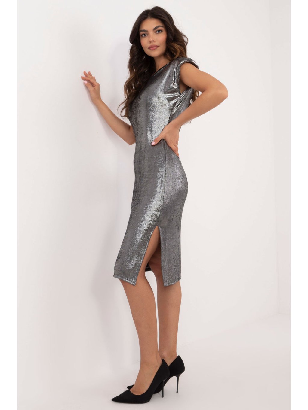 Elegantní koktejlové šaty s úzkým střihem, ideální na večírky a formální události. Vyrobené z kombinace polyesteru a viskózy, šaty mají lesklý materiál s různorodou texturou, která jim dodává eleganci. Vložené polštářky na ramenou dodávají stylizaci moderní strukturu a jemně zdůrazňují siluetu. Šaty mají midi délku, což zajišťuje elegantní vzhled, a krátký rukáv a kulatý výstřih dodávají klasický charakter. Šaty nemají zapínání, což zdůrazňuje jejich minimalistický a elegantní styl. Ideální volba na večerní výlety.