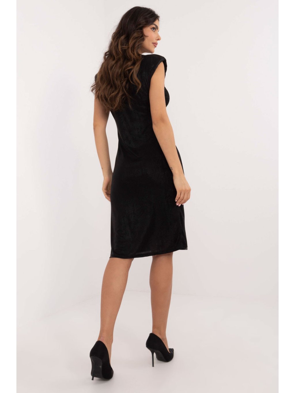 Elegantní koktejlové šaty ve střihu tužky, ideální na večírky a společenské události. Vyrobené z kombinace polyesteru a viskózy, šaty mají lesklý materiál s různorodou fakturou, která jim dodává rafinovanost. Všité polštářky na ramenou dodávají stylizaci moderní strukturu, jemně zdůrazňující siluetu. Šaty mají midi délku, což zajišťuje elegantní vzhled, a krátký rukáv a kulatý výstřih dodávají klasický charakter. Šaty nemají zapínání, což zdůrazňuje jejich minimalistický a elegantní styl. Ideální volba na večerní vycházky.