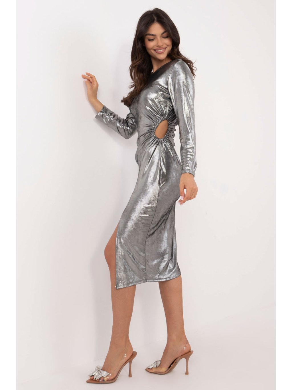 Elegantní úzké šaty z lesklé látky, vytvořené s ohledem na výjimečné příležitosti a večerní výlety. Vyrobené z polyesteru a elastanu, zajišťují ideální přizpůsobení postavě, zdůrazňují její tvary a zároveň nabízejí pohodlí a volnost pohybu. Hladký materiál s jemným leskem jí dodává rafinovaný charakter, ideální na večírky nebo setkání. Šaty mají dlouhý rukáv a kulatý výstřih, co zdůrazňuje klasický, elegantní styl. Další ozdobné záhyby na boku přinášejí zajímavý detail, který jí dodává lehkost a modernost. Jedná se o skvělou volbu pro výjimečné výlety, která spojuje klasickou formu s trochou lesku a elegance.
