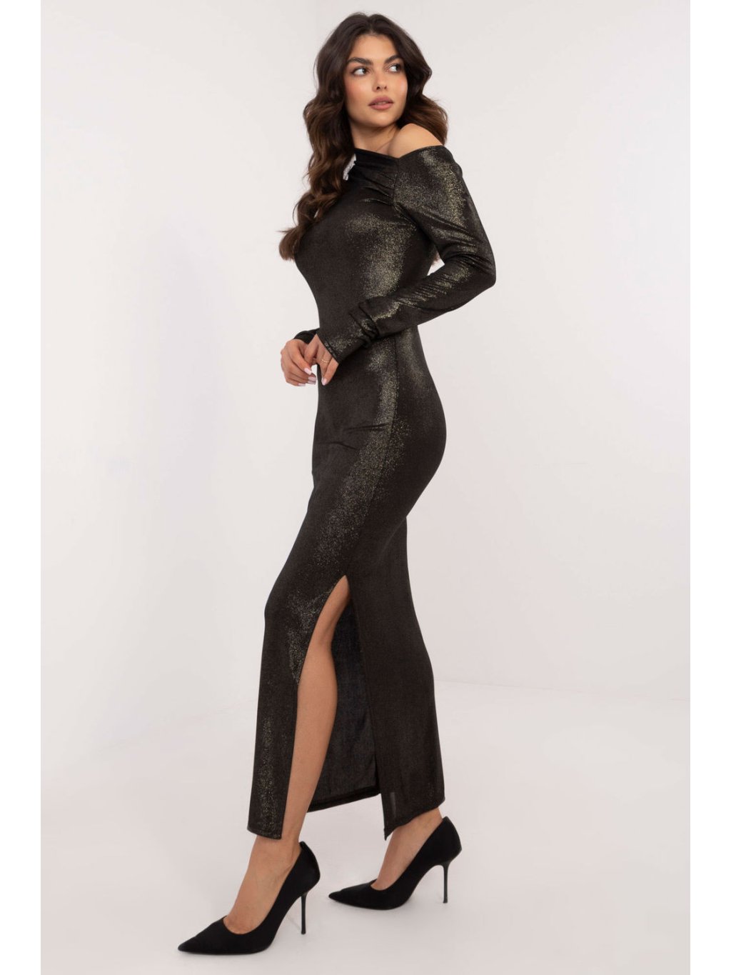 Elegantní večerní šaty s úzkým střihem, skvělé na slavnostní události a večírky. Vyrobena z kvalitního materiálu s přídavkem polyesteru a viskózy, s jemně strukturovanou látkou, která dodává kreaci eleganci. Maxi délka a přiléhavý střih jemně zdůrazňují ženskou postavu. Asymetrický výstřih a vestavěné polštářky na ramenou dodávají šatům výrazný charakter, zatímco dlouhé rukávy s manžetami a dírkou na palec poskytují moderní a intrigující vzhled. Další ruchy na látku přidávají eleganci a vytvářejí jedinečný styl bez zapínání.