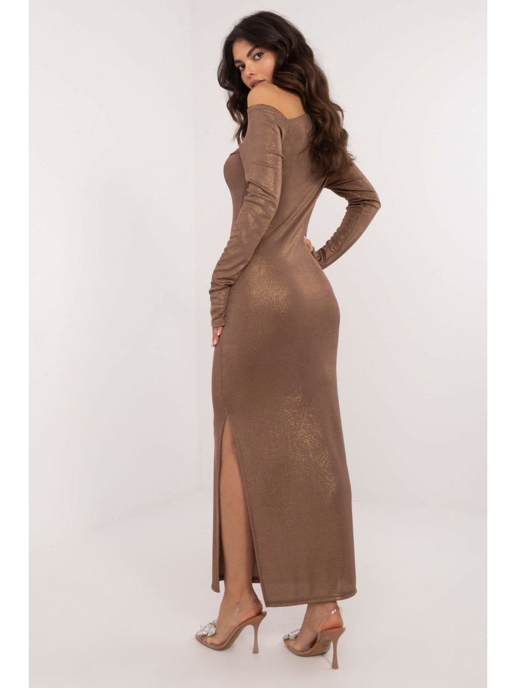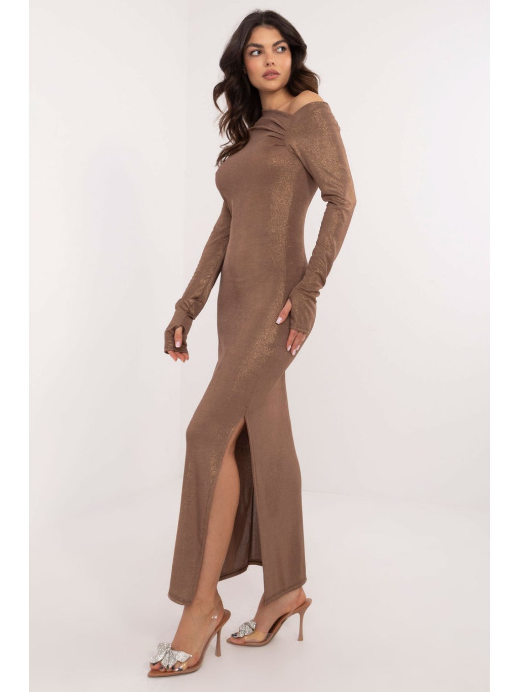 Elegantní večerní šaty s úzkým střihem, skvělé na slavnostní události a večírky. Vyrobena z vysoce kvalitního materiálu s přídavkem polyesteru a viskózy, s jemně texturovanou látkou, která dodává kreaci eleganci. Maxi délka a přiléhavý střih jemně zdůrazňují ženskou postavu. Asymetrický výstřih a vestavěné polštářky na ramenou dodávají šatům výrazný charakter, zatímco dlouhé rukávy s manžetami a dírkou na palec poskytují moderní a intrigující vzhled. Další rýhy v materiálu přidávají eleganci a vytvářejí jedinečný styl bez zapínání.