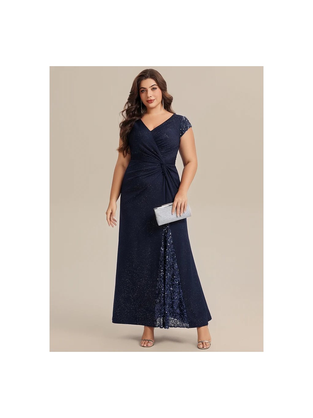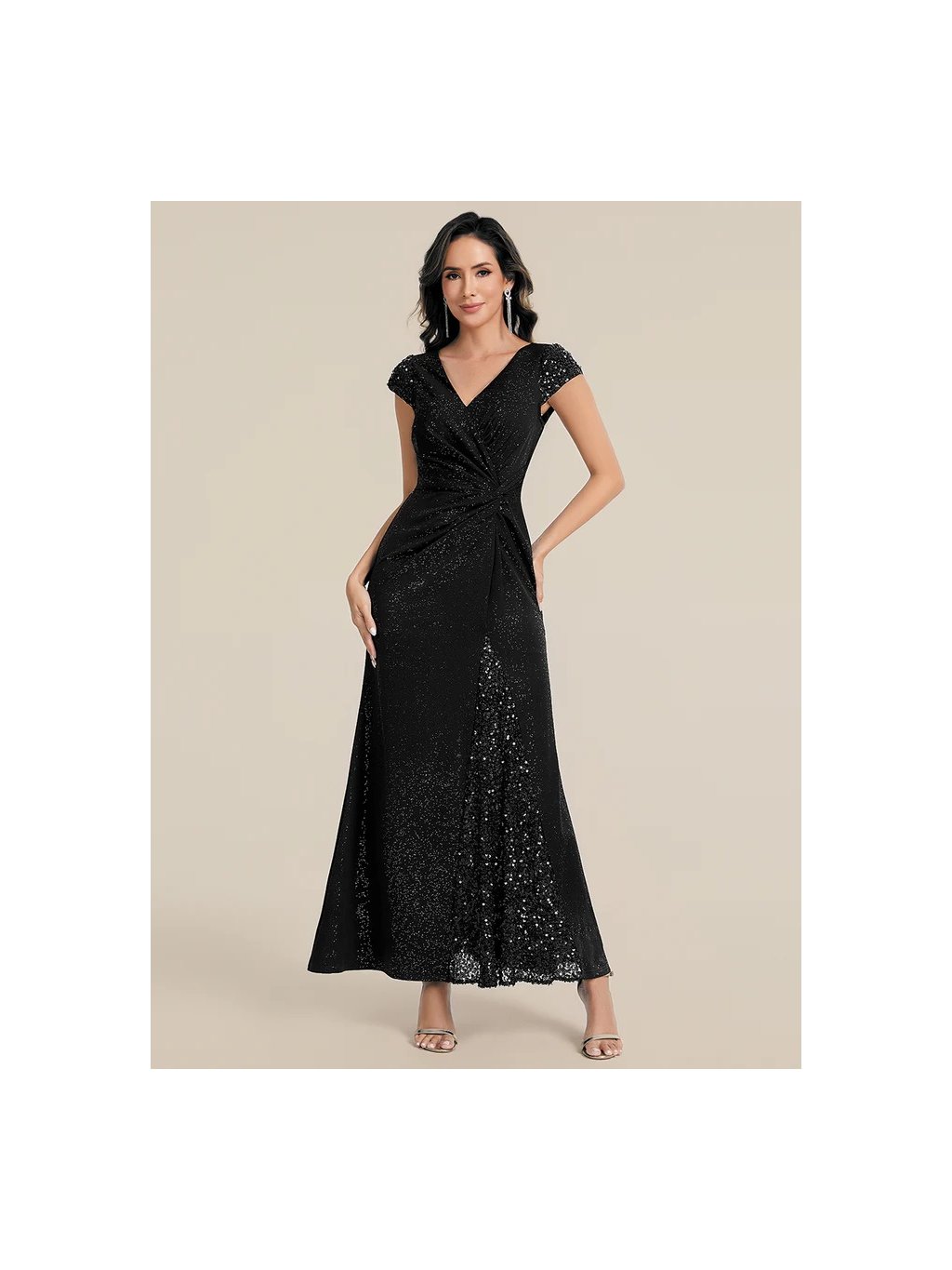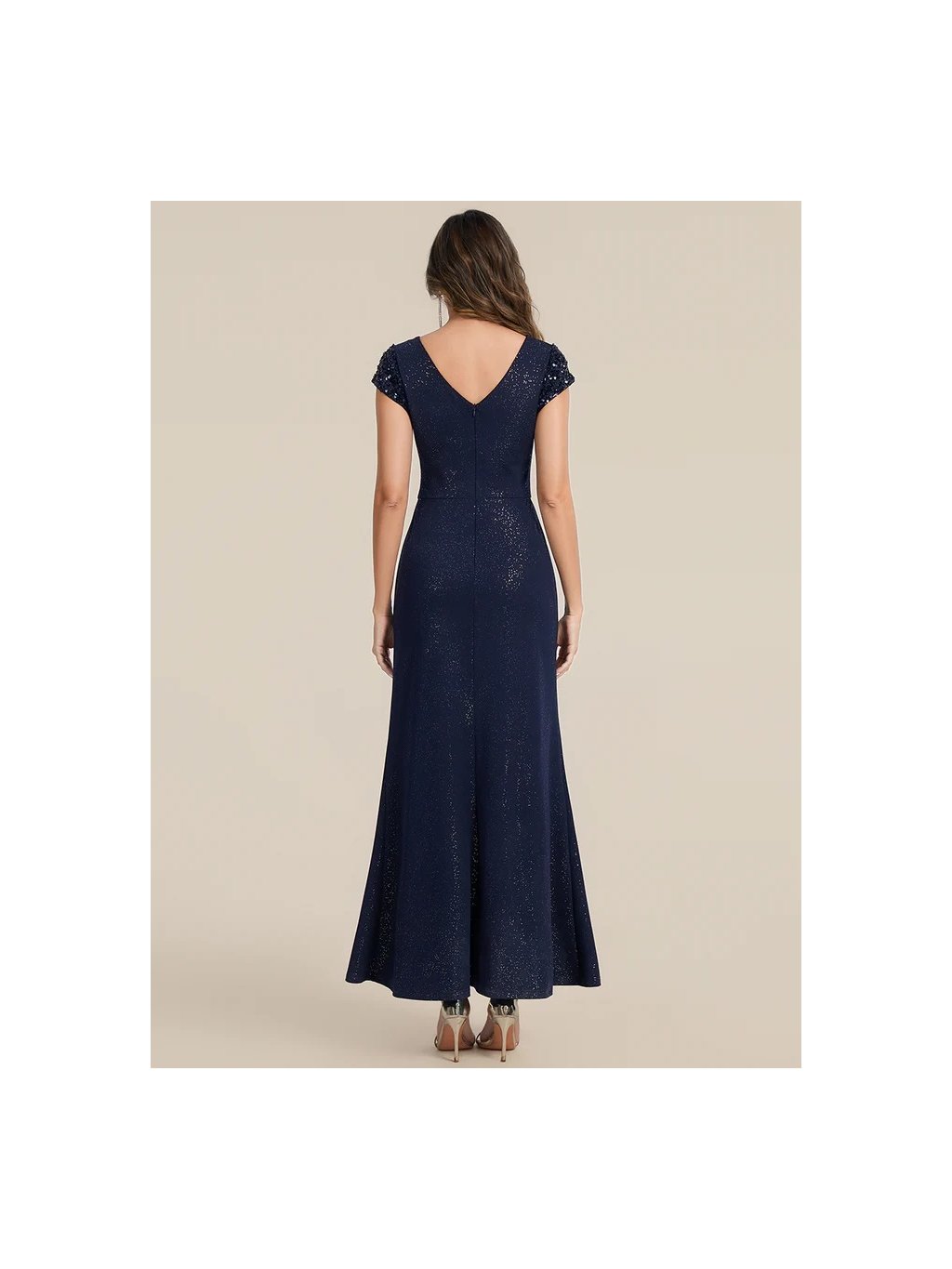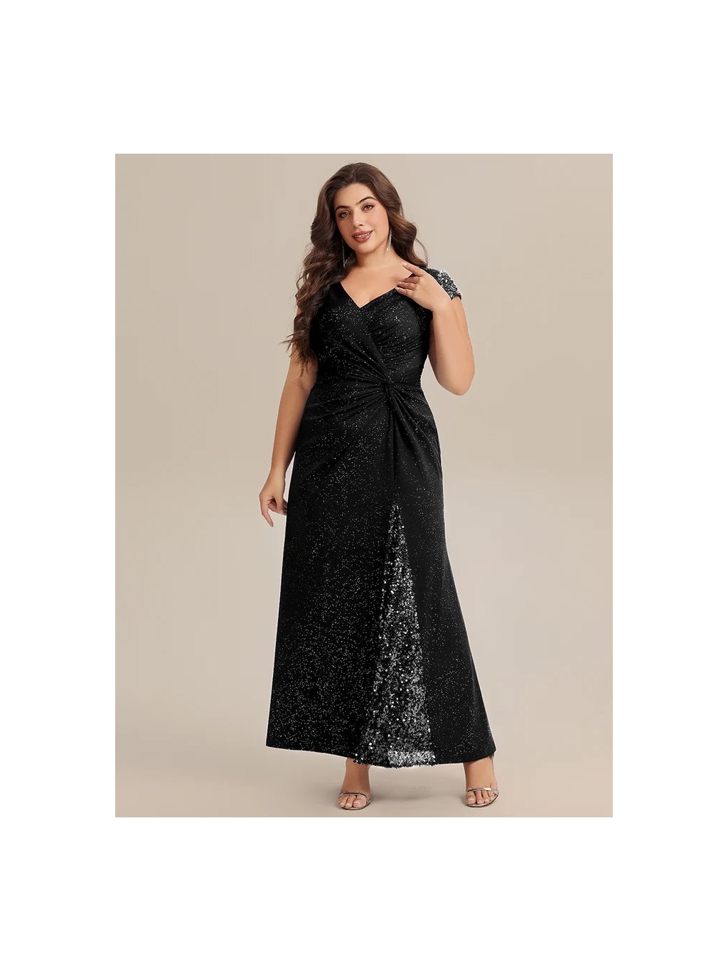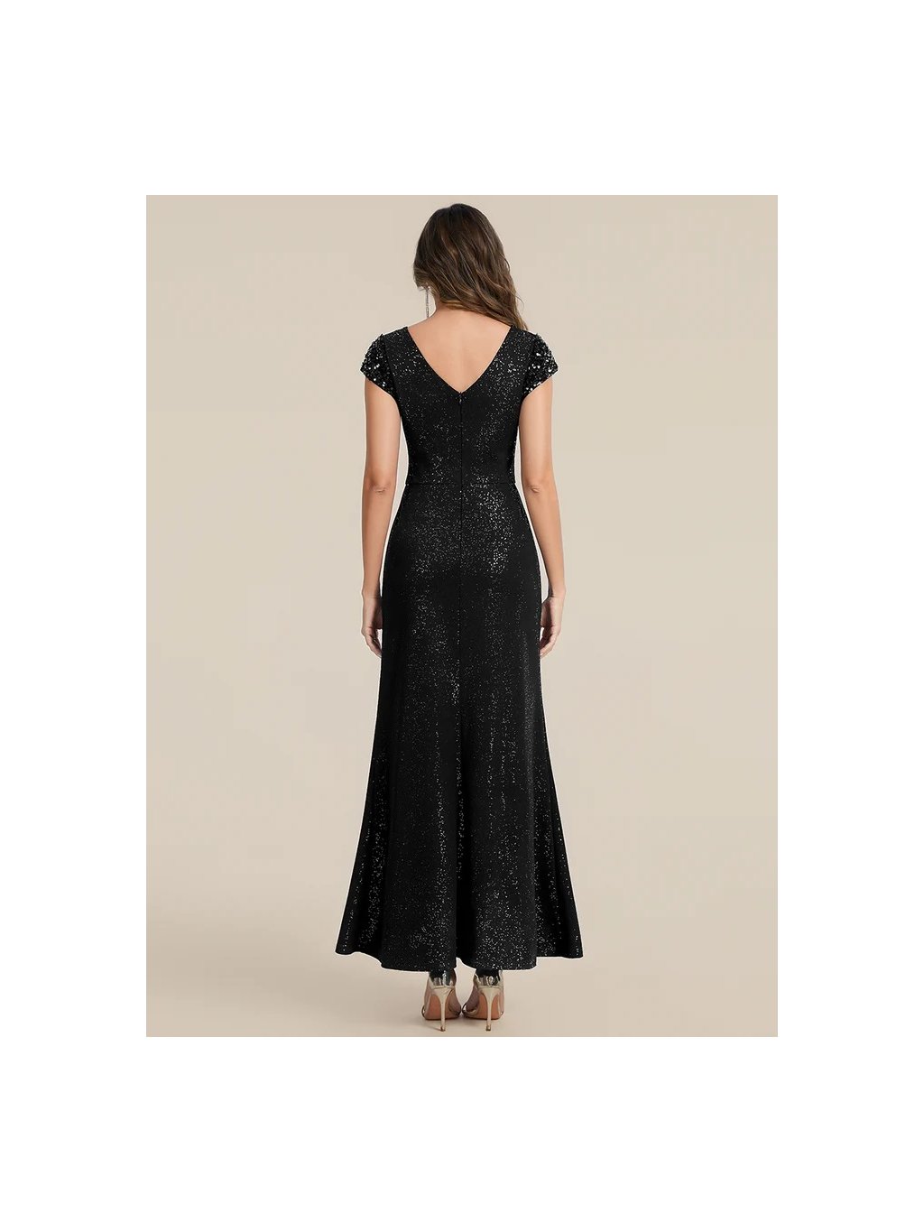 Úchvatné plesové šaty Ever Pretty. Šaty mají krátké rukávy. Na prsou véčkový výstřih. Sukně má rozparek. Celé šaty jsou posypány třpytkami.