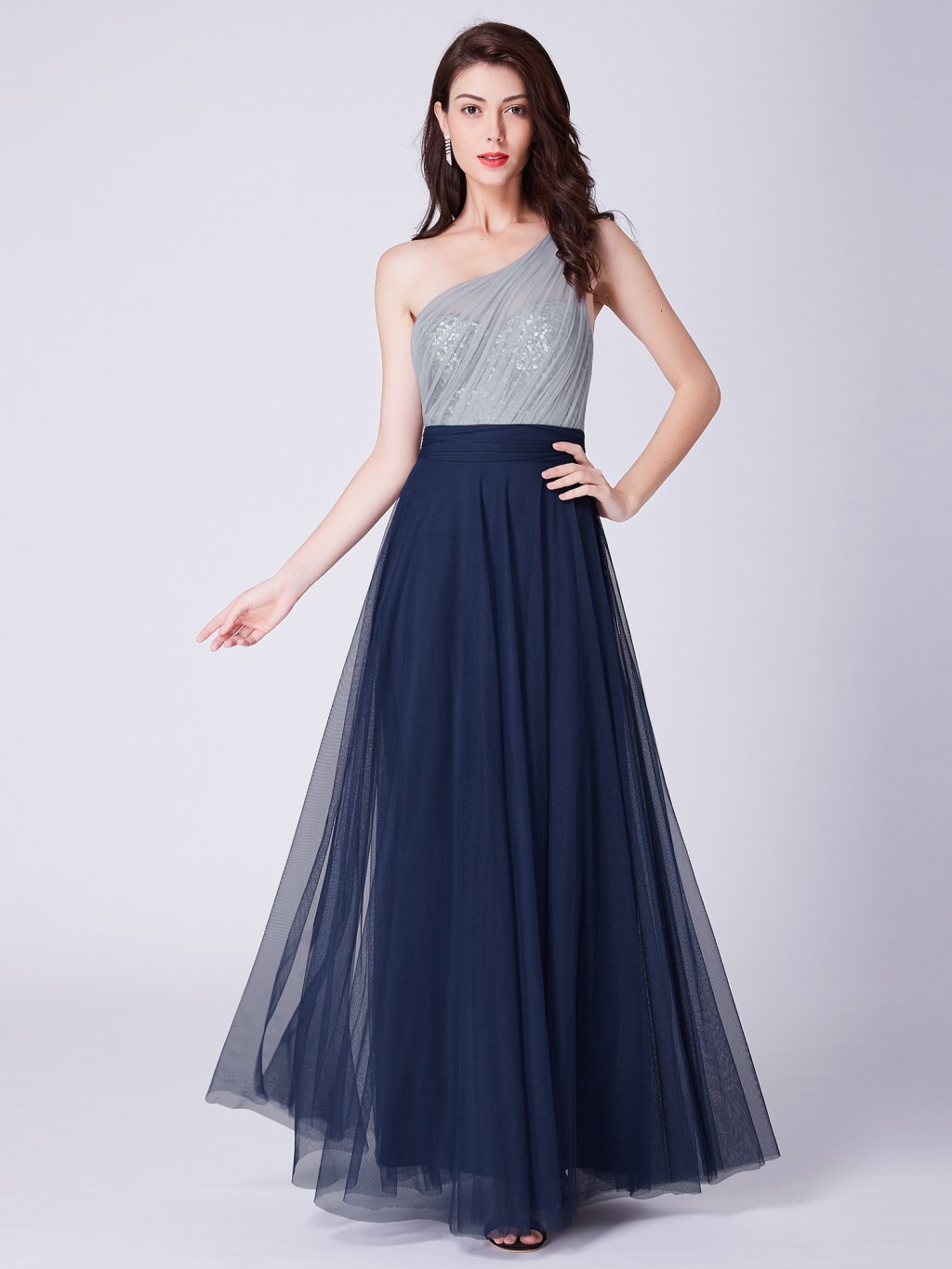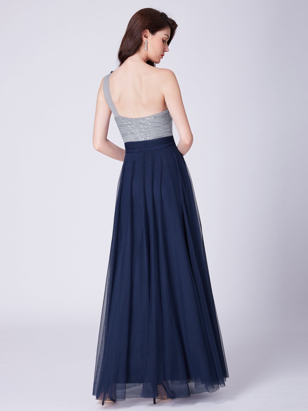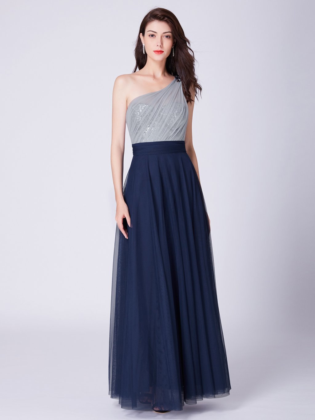 Šaty jsou na jedno ramínko. Mají skrytý zip na zádech. Šaty mají vycpávky, je možné vzít bez podprsenky. Spodní část vrchního dílu je zdobená flitry, vrchní díl je šedá průhledná látka. Na ramínku je zdobená spona. Sukně má modrou barvu. Šaty jsou velmi lehoučké, dělají krásnou postavu.