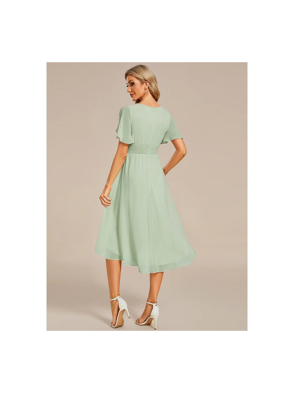Jednoduché společenské šaty pod kolena na svatbu i večírek. Volné rukávy , kulatý vystřih, krásné jemné řasení. šaty se zapínám vzadu na zip.