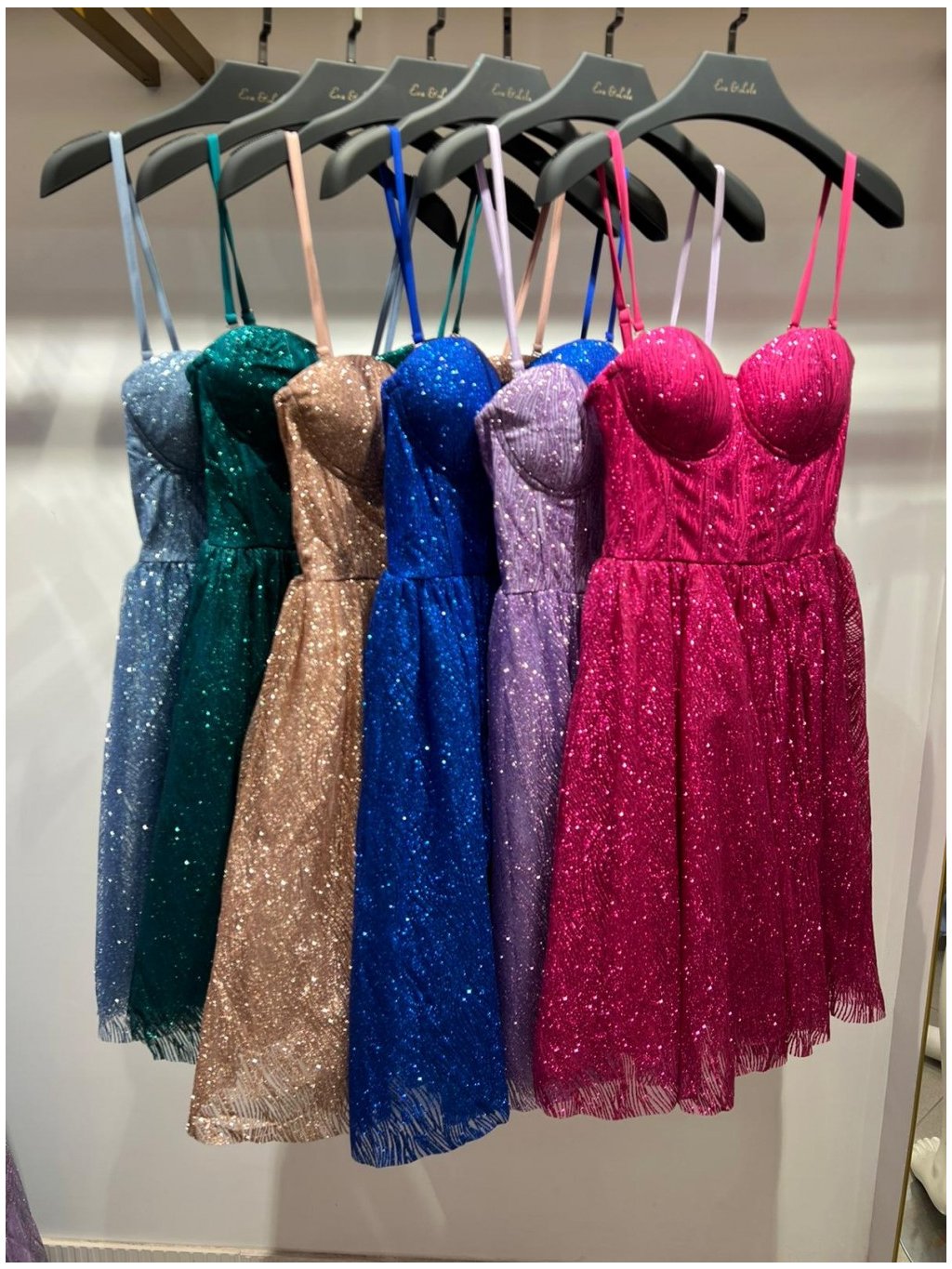 Krátké luxusní šaty francouzské značky Eva & Lola. Šaty jsou na špagetová ramínka(lze odepnout), korzetový top a široká sukně. Šaty mají vloženou vycpávku, můžete si je vzít bez podprsenky. Vzadu zapínání na zip.