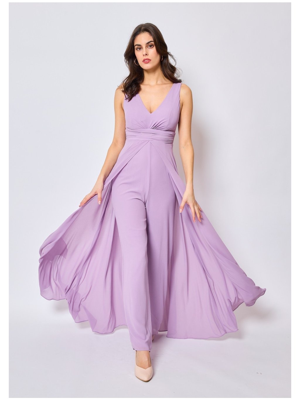 Netradiční model kalhotové šaty ,bez rukavu, zezadu jako šaty a zepředu kalhoty.Vzadu skrytý zip.Výstřih do V bez vycpávek.