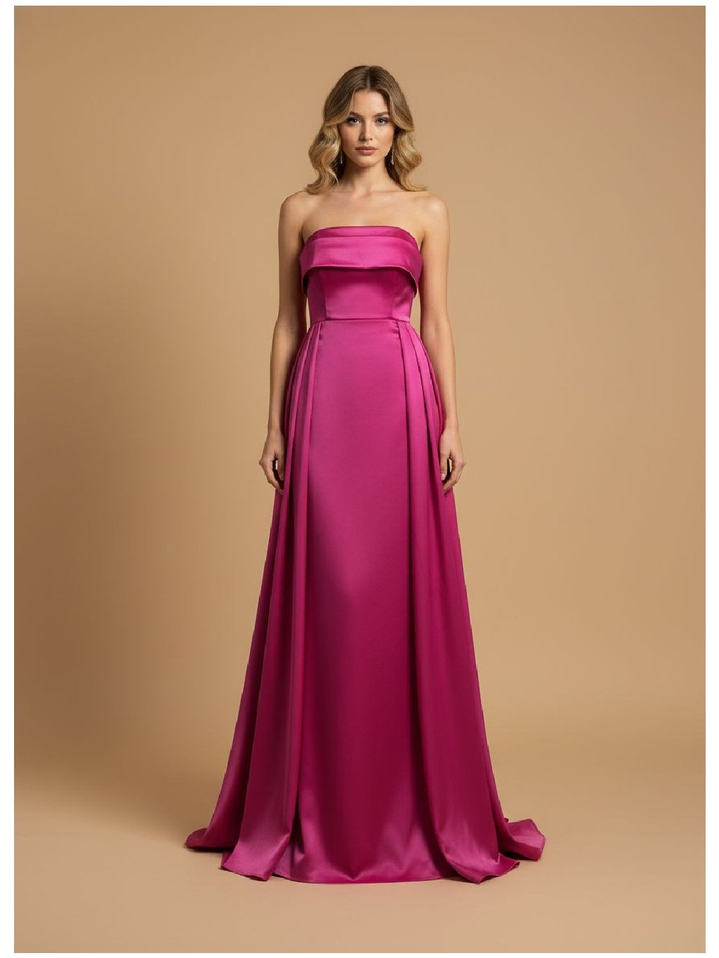 Dlouhé šaty bez ramínek s elegantním a minimalistickým vzhledem, přiléhavé v oblasti hrudníku a pasu, které se směrem dolů jemně rozšiřují a splývají až na zem.
