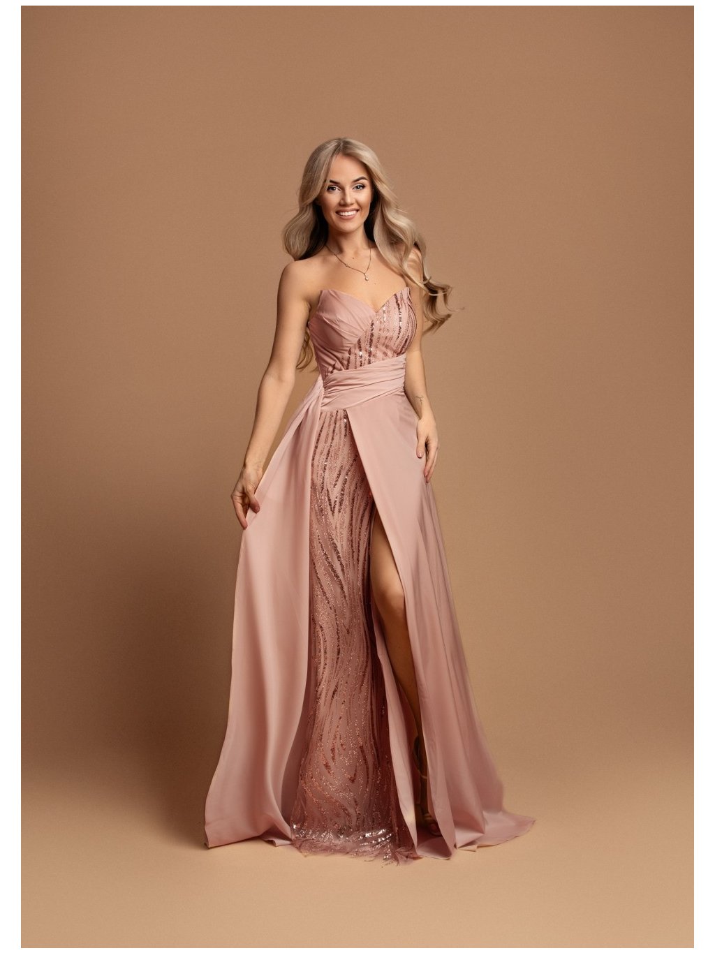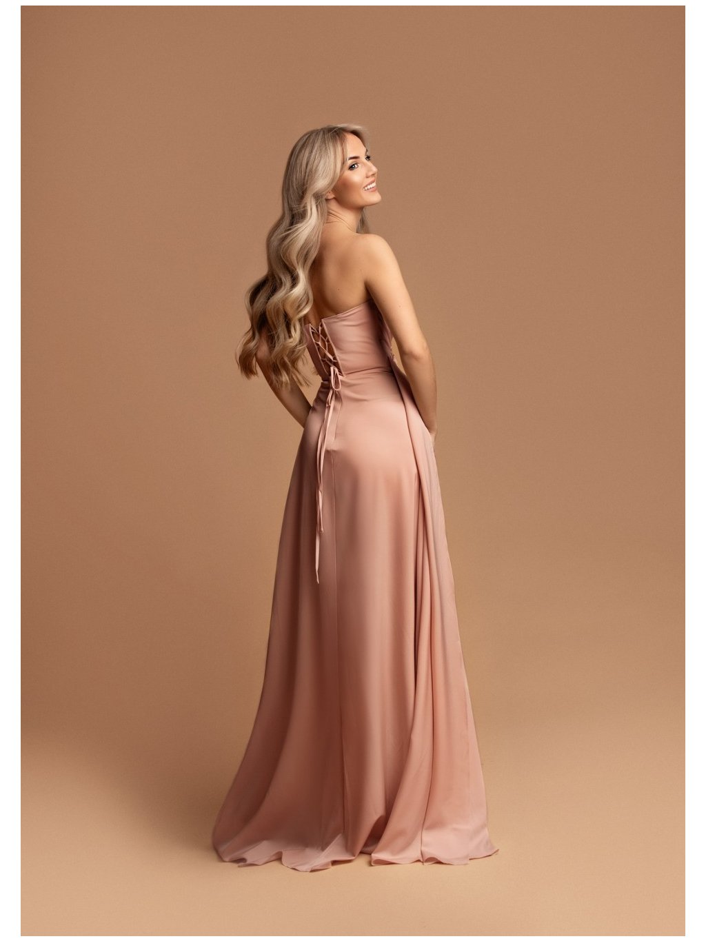 Stylové šaty společenské hladký vzhled, se zajímavým průstřihem, vysokým rozparkem. Střih korzetový vzadu na šněrování
