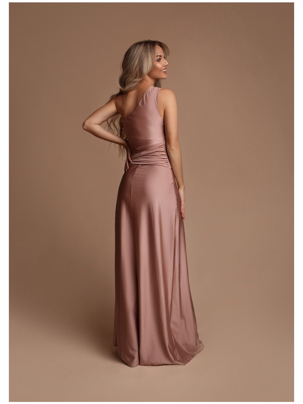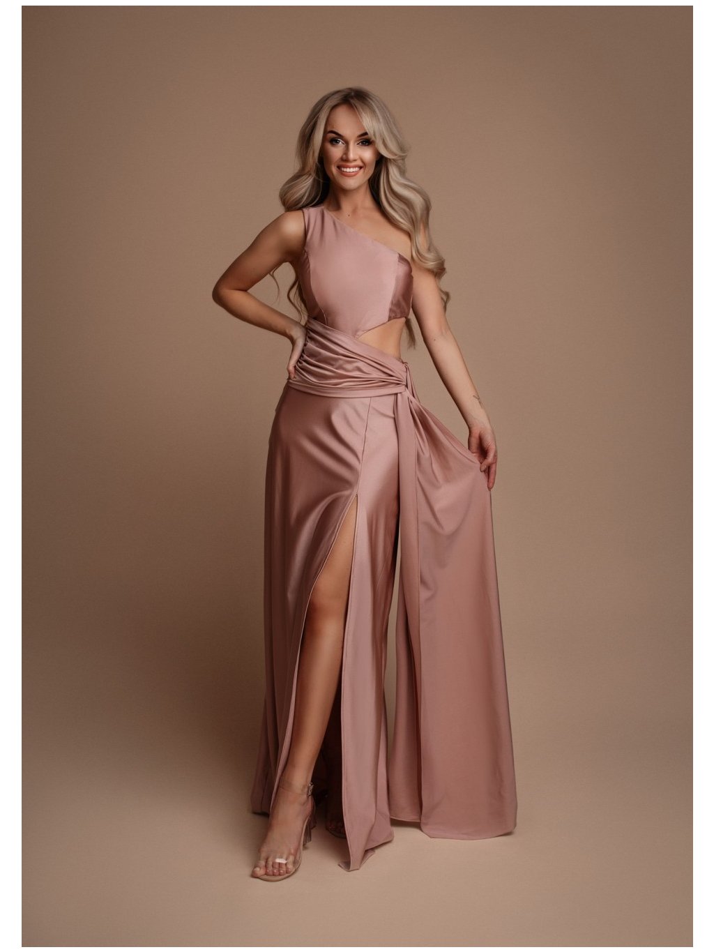 Stylové šaty společenské hladký saténový vzhled, se zajímavým průstřihem, vysokým rozparkem. Střih na jedno rameno.