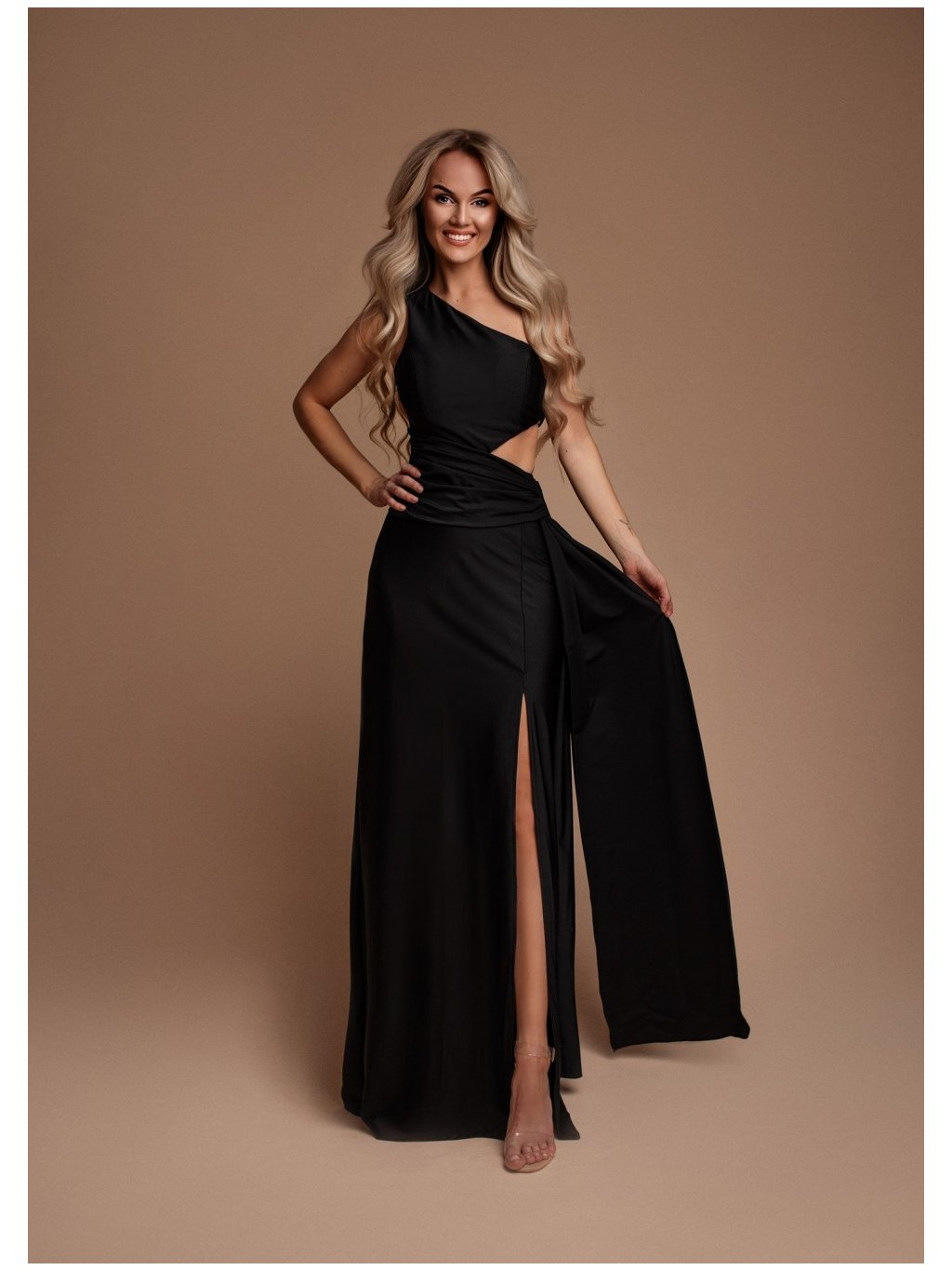 Stylové šaty společenské hladký saténový vzhled, se zajímavým průstřihem, vysokým rozparkem. Střih na jedno rameno.