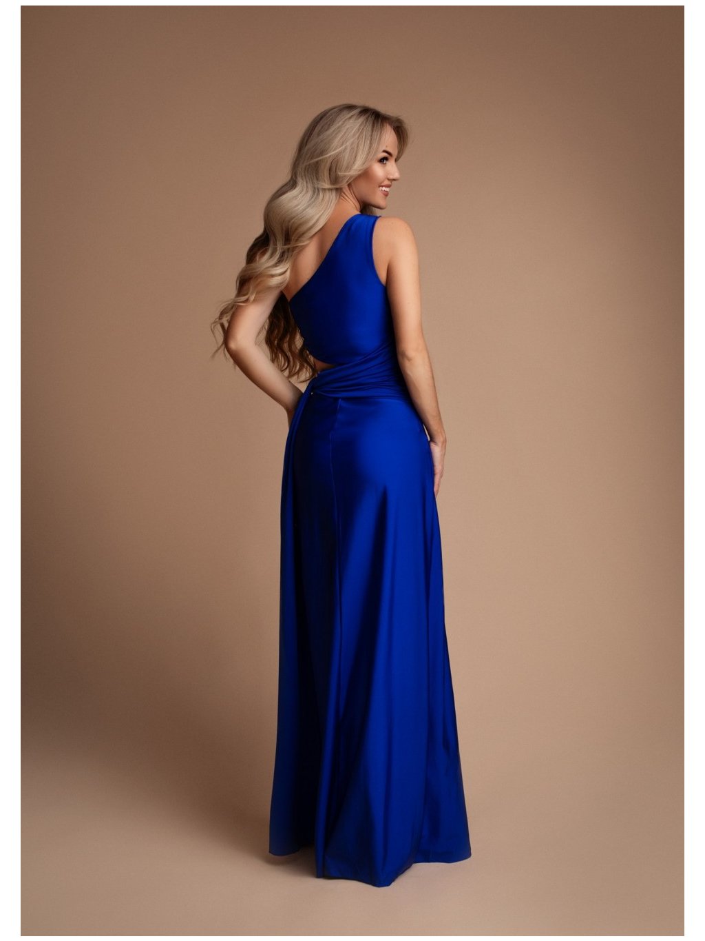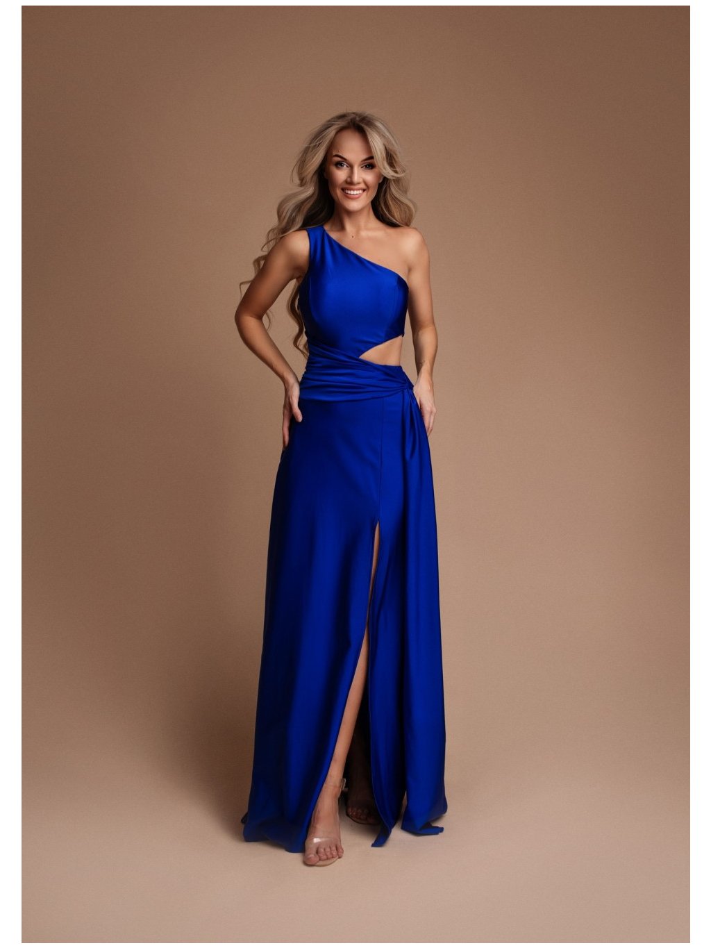Stylové šaty společenské hladký saténový vzhled, se zajímavým průstřihem, vysokým rozparkem. Střih na jedno rameno.