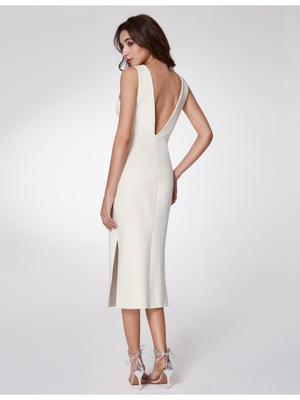 Krásné krátké bílé šaty. S rozparkem, jednoduchý střih, skrytý zip na zádech. Na zádech hluboký véčkový výstřih.