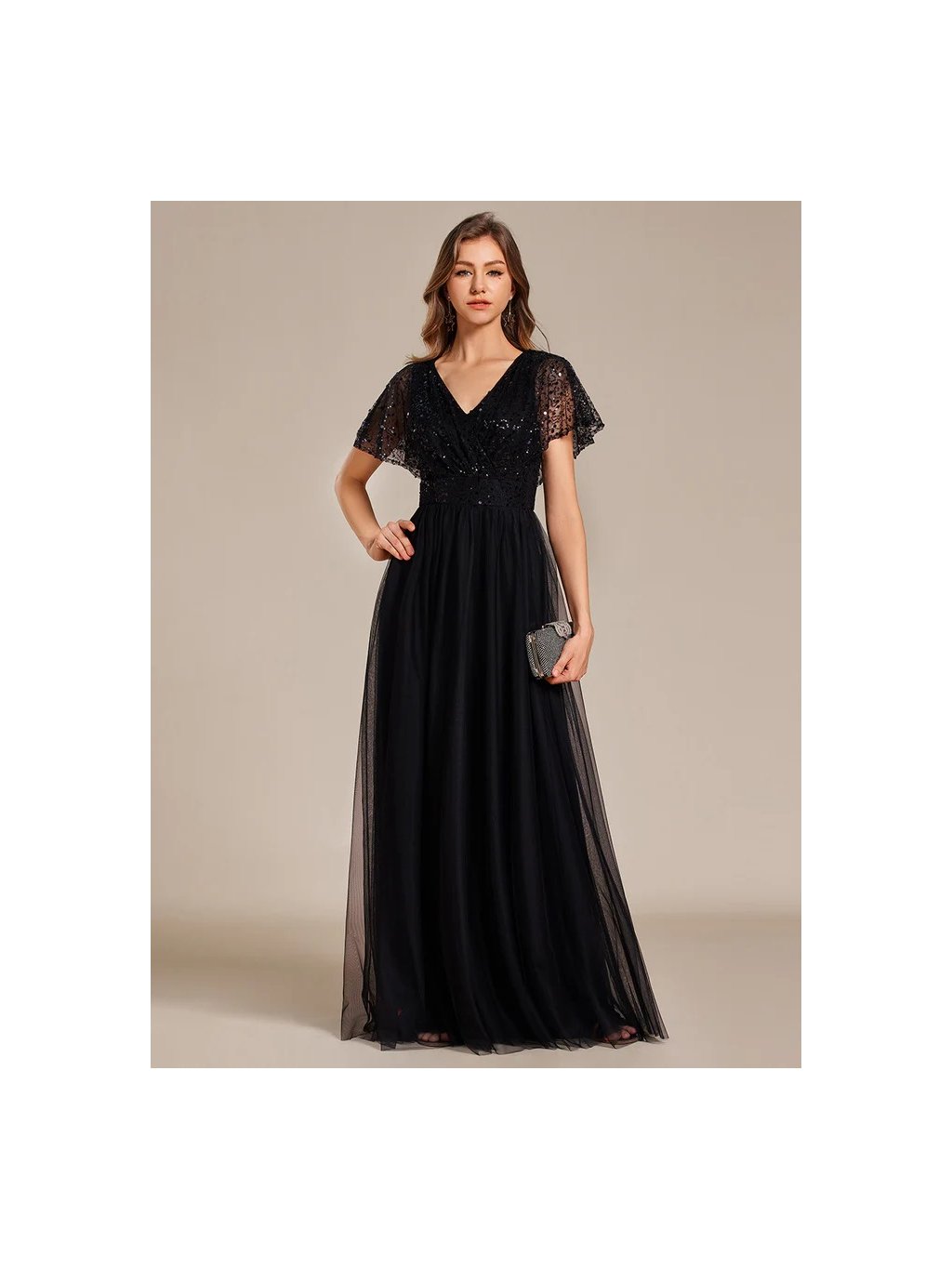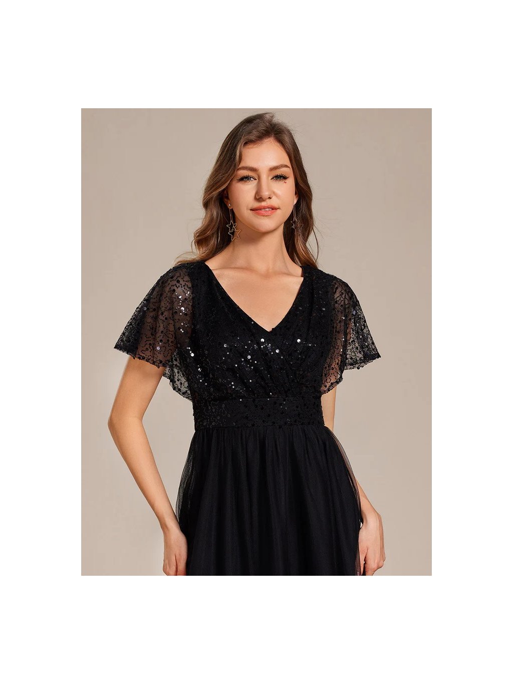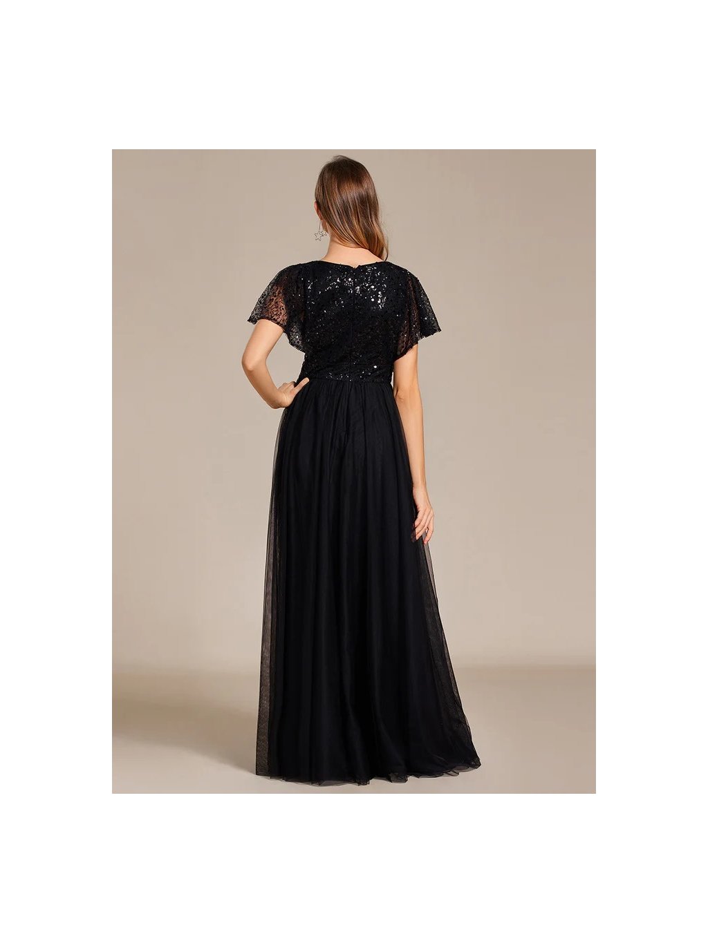 Nádherné černé šaty Ever Pretty. Dlouhé šaty na široká ramínka a s krátkým rukávkem. Rukávky jsou volné průsvitné s flitry. Na prsou mají šaty velký výstřih. Na zádech skrytý zip.Celý vršek je posetý flitry.