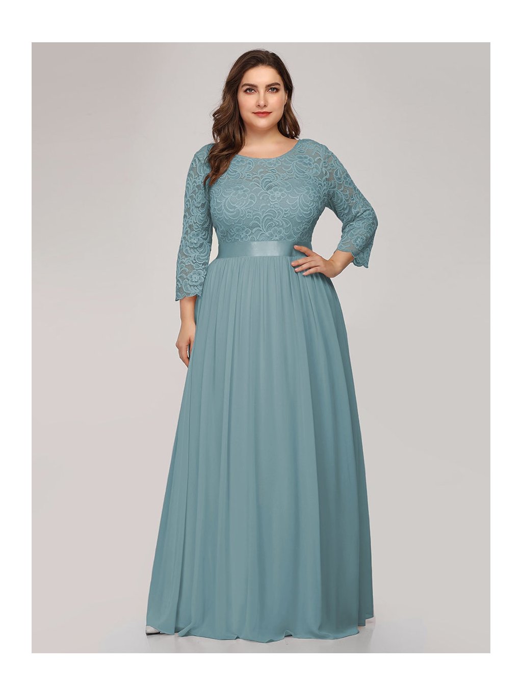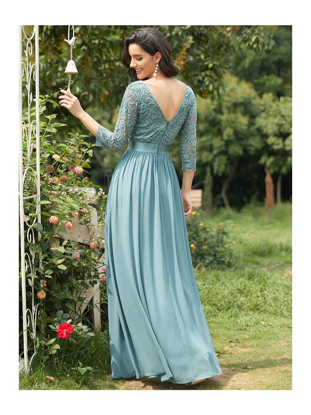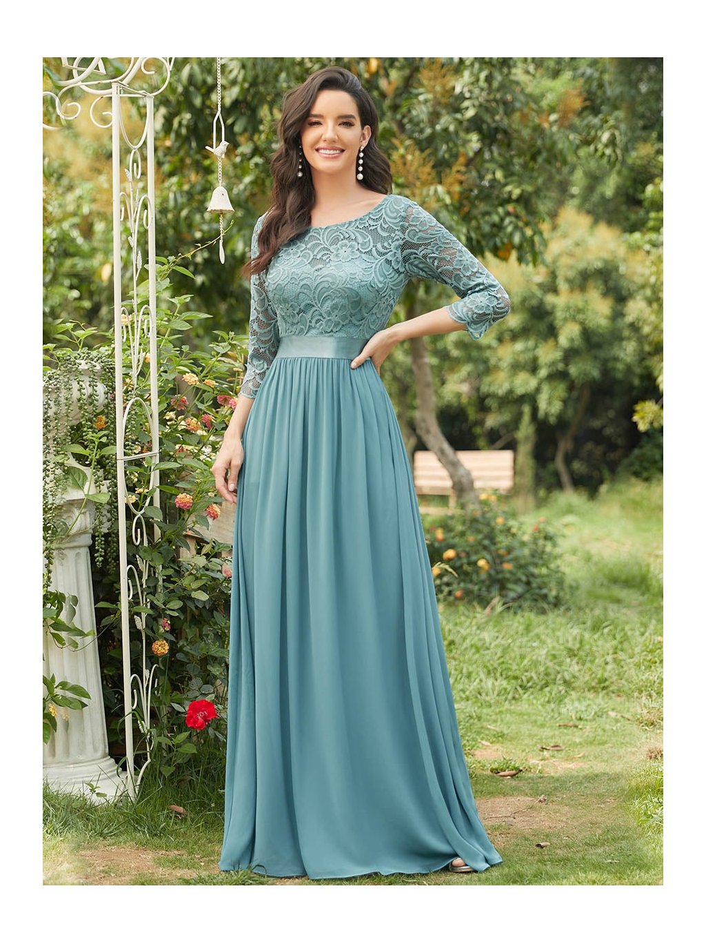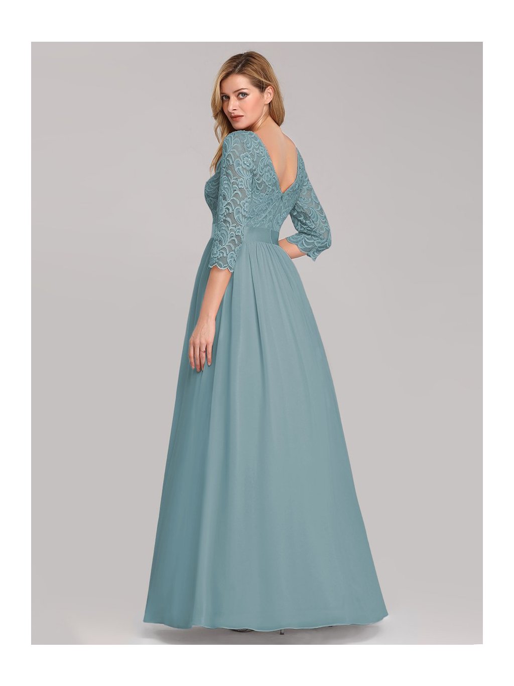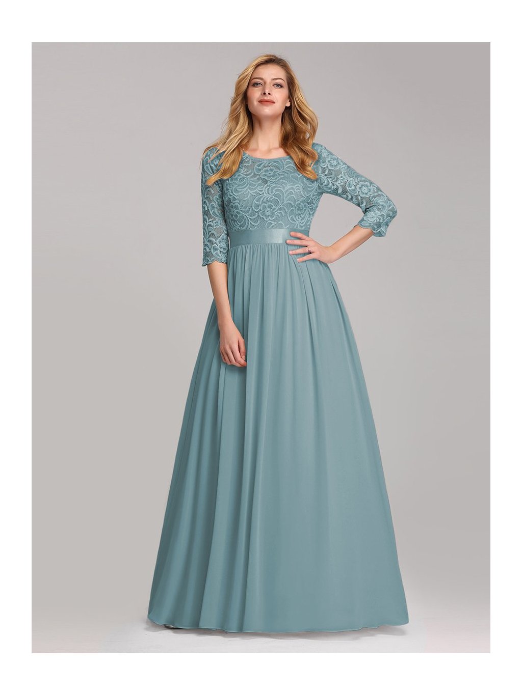 Luxusní krajkové modré šaty Ever Pretty. Šaty mají hladkou sukni a krajkový vršek s dlouhým rukávem. Na prsou mají lodičkový výstřih a na zádech hluboký véčkový. Na zádech mají skrytý zip. Mají vložené vycpávky, lze vzít bez podprsenky.