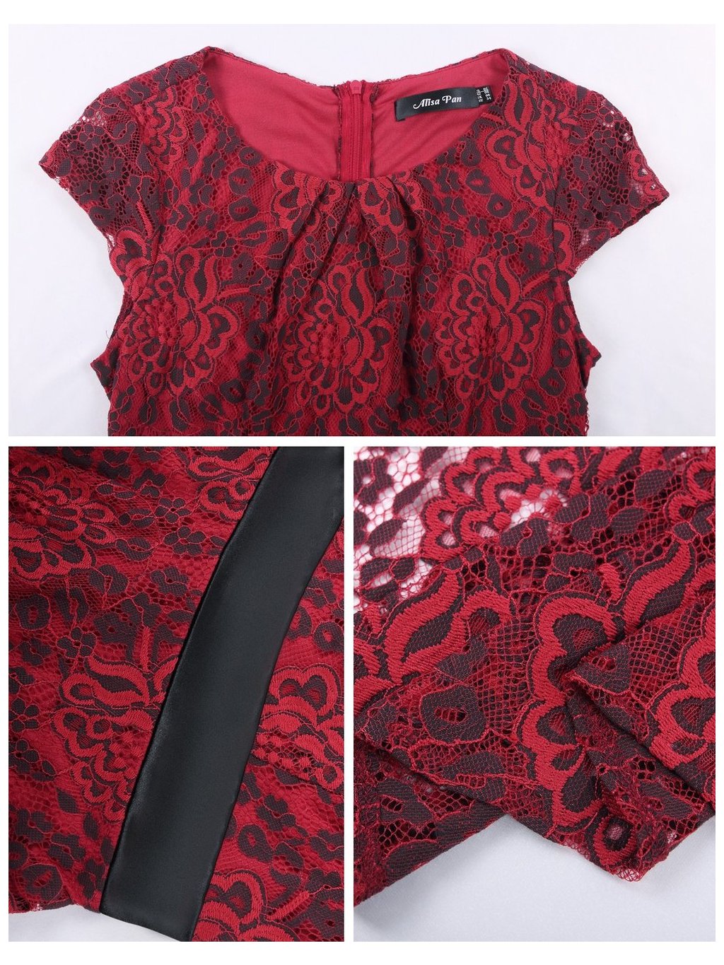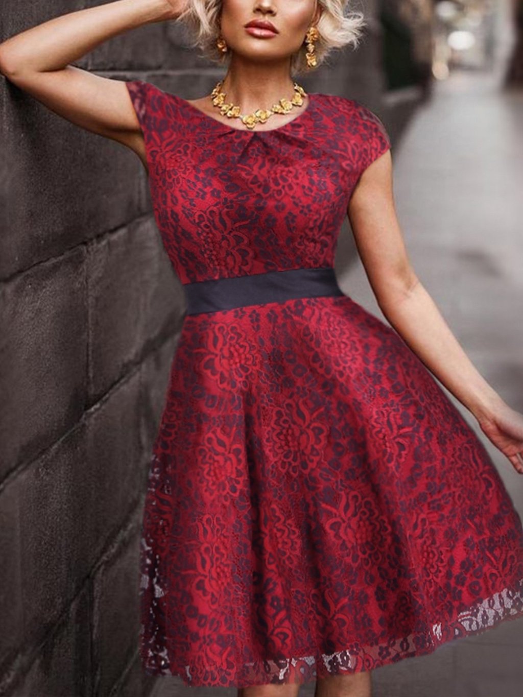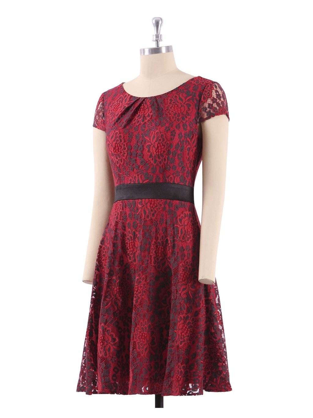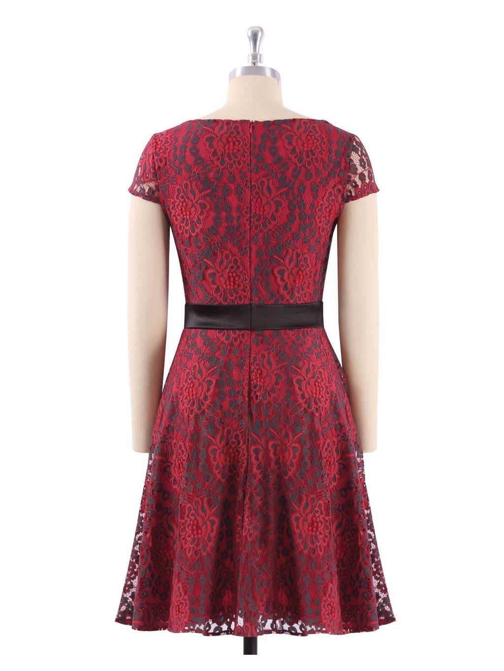 Krásné letní šaty, vhodné do společnosti. Červená krajka se vzorem, v pase černý pásek. Šaty mají kulatý výstřih, skrytý zip na zádech.