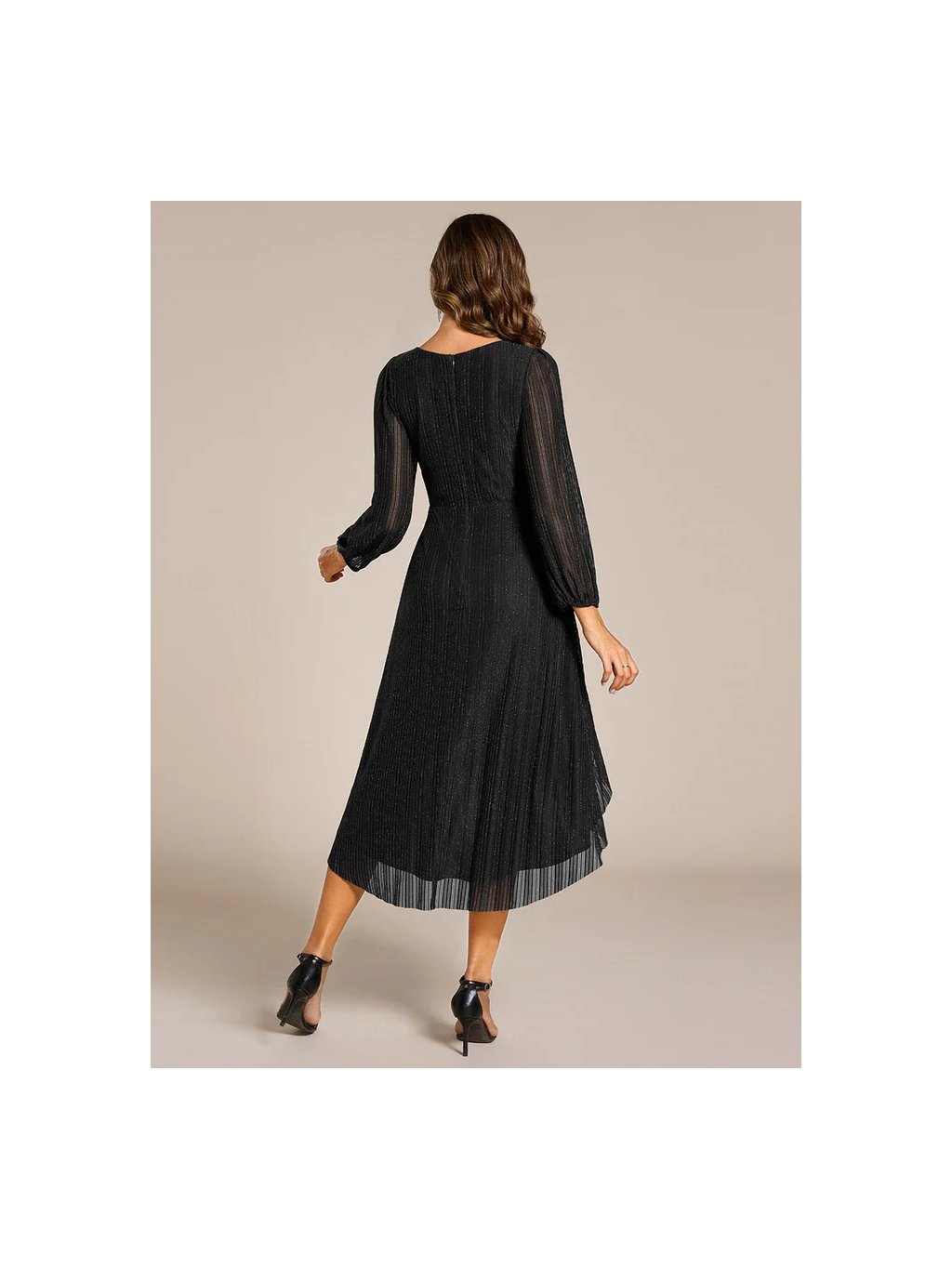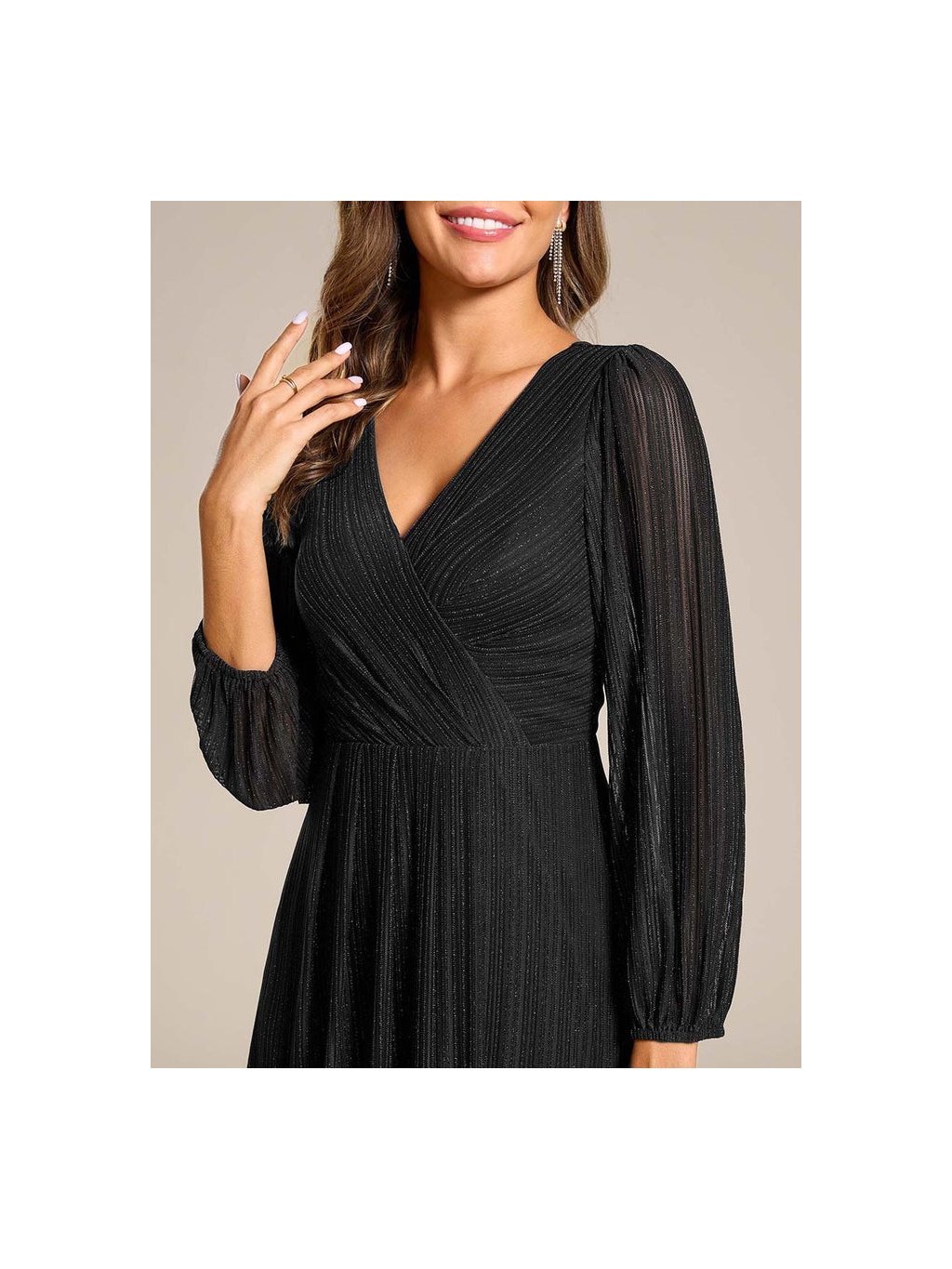 Úchvatné krátké plesové šaty Ever Pretty. Šaty mají dlouhé rukávy. Na prsou véčkový výstřih. Mají krásný lesklý nádech