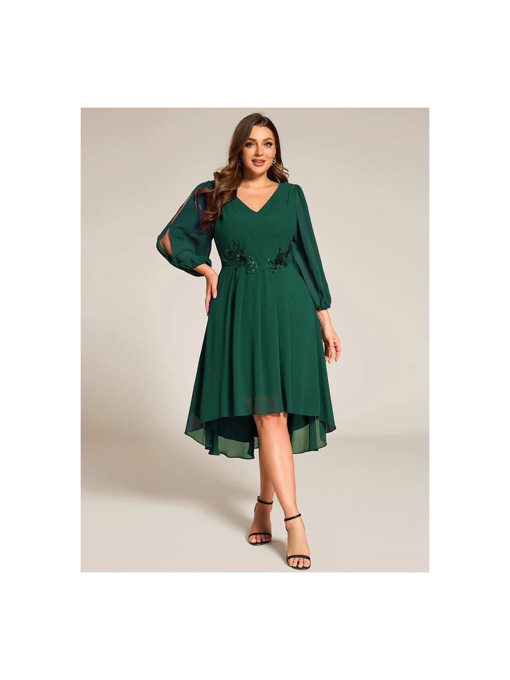 Úchvatné krátké plesové šaty Ever Pretty. Šaty mají dlouhé prostřižené rukávy. Na prsou véčkový výstřih.