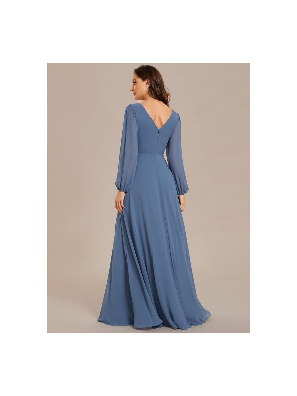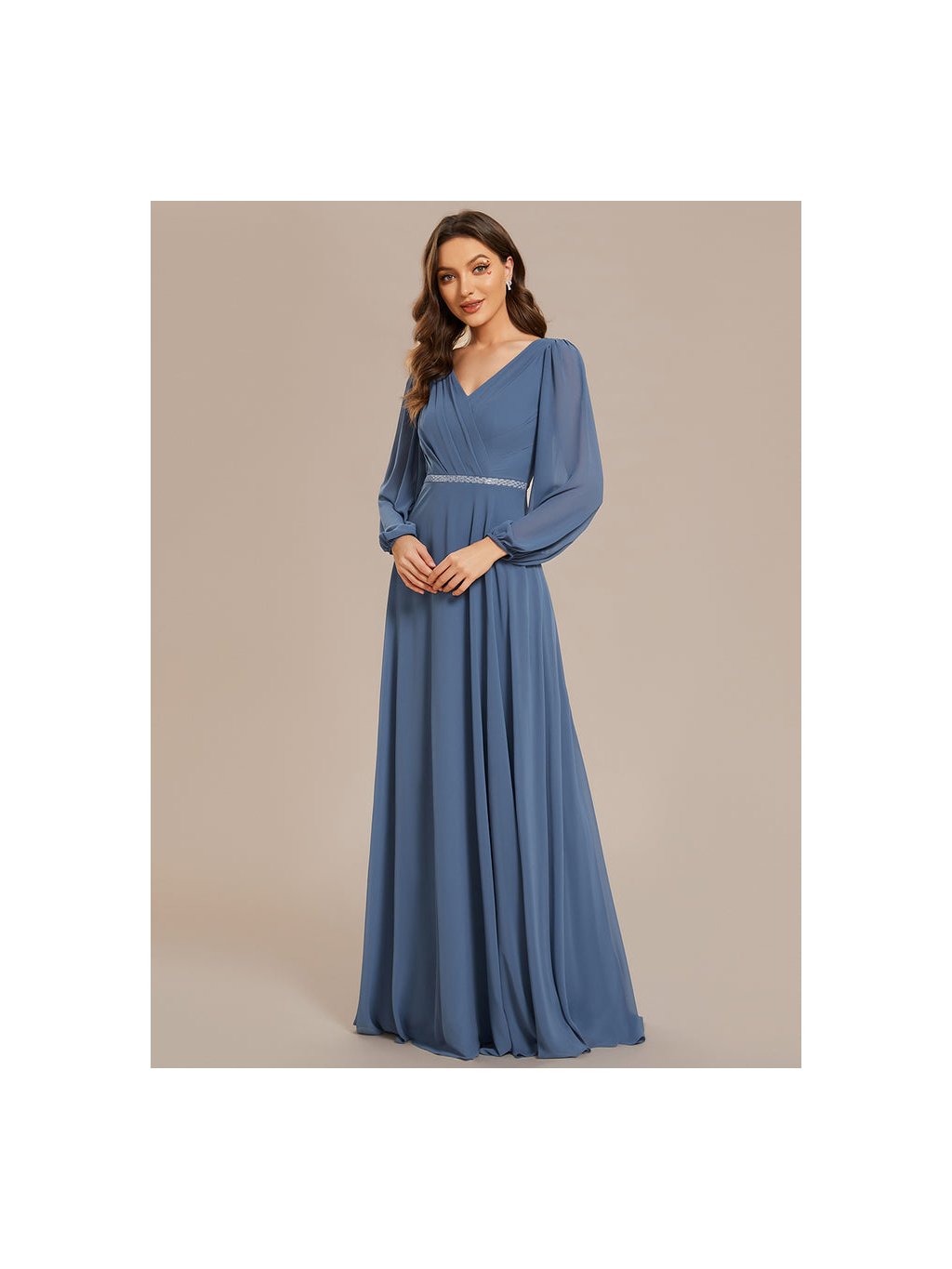 Jednodušše střižené plesové šaty Ever Pretty. Šaty mají dlouhé rukávy. Na prsou véčkový výstřih.