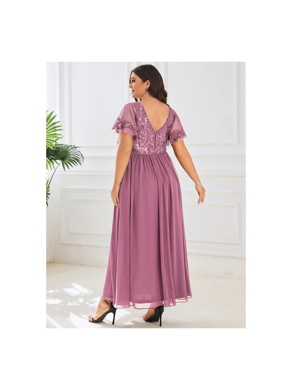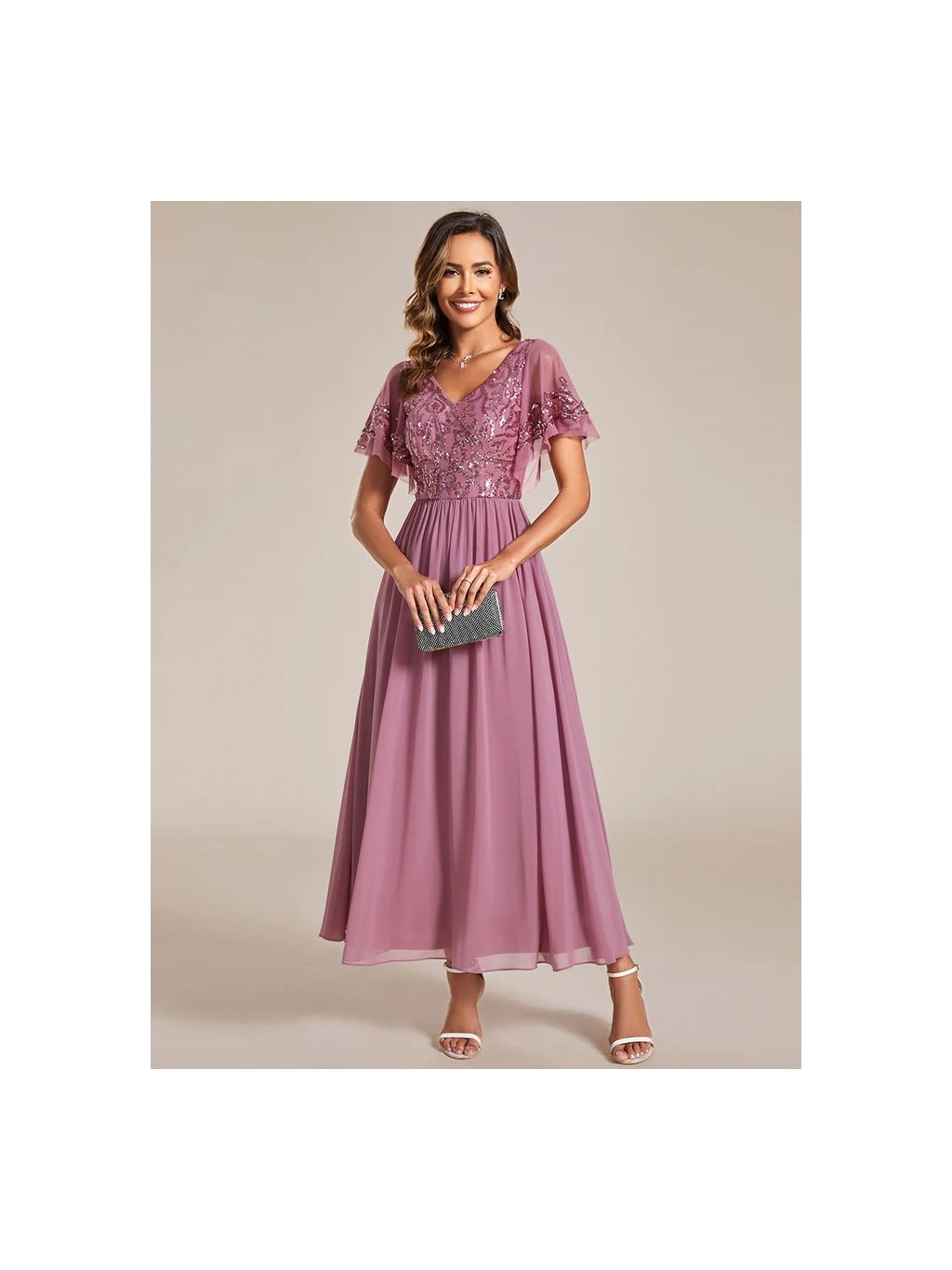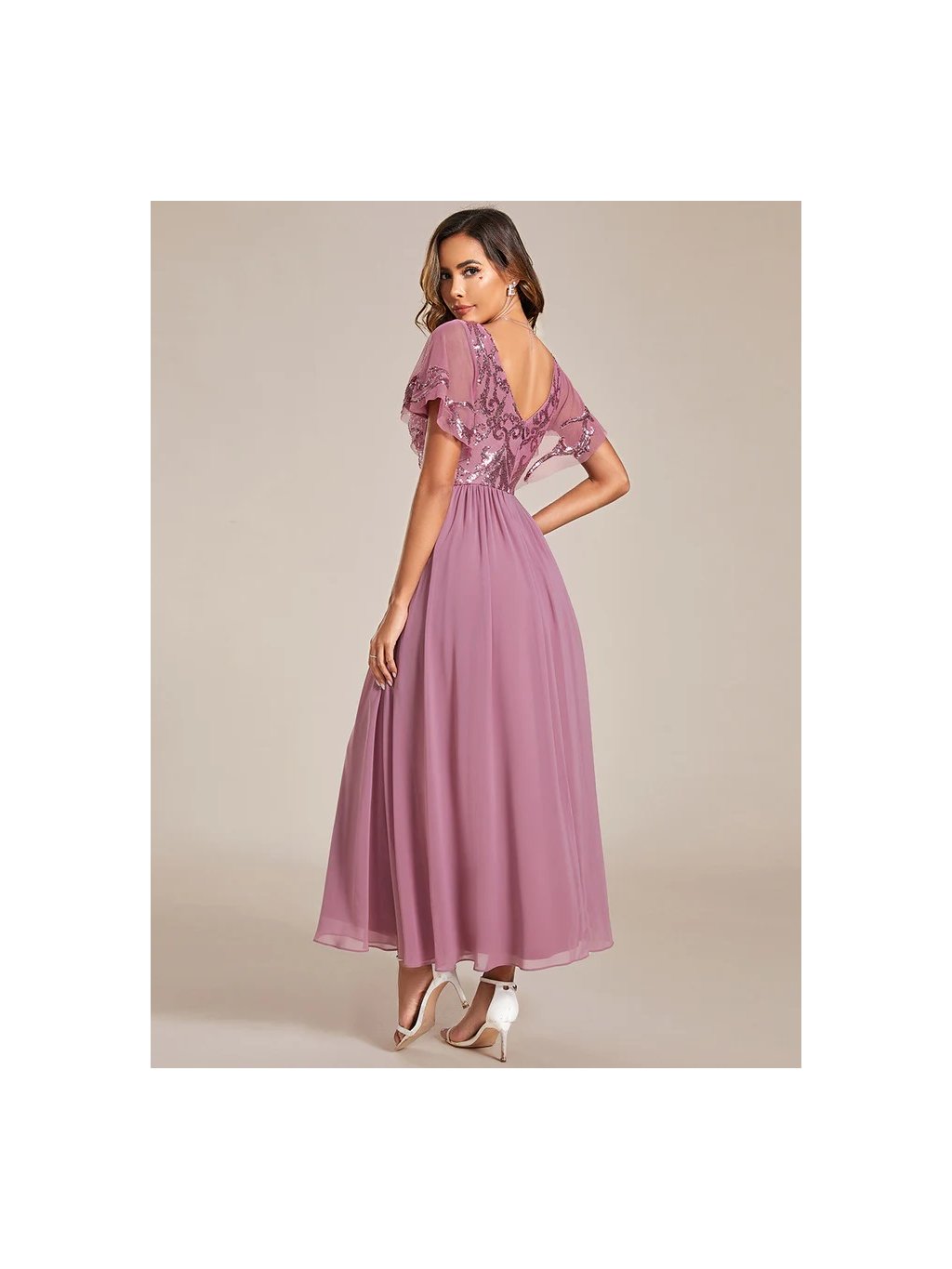 Šaty mají krátké volné rukávky. Na prsou i zádech je lodičkový výstřih. Vrchní díl je vyšívaný. Šatičky mají skrytý zip na zádech a nemají vycpávky.