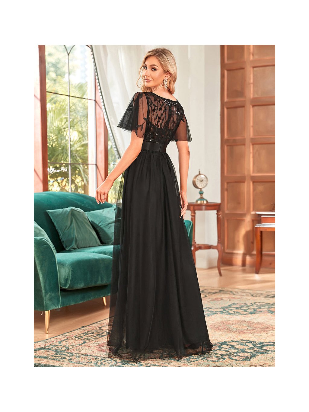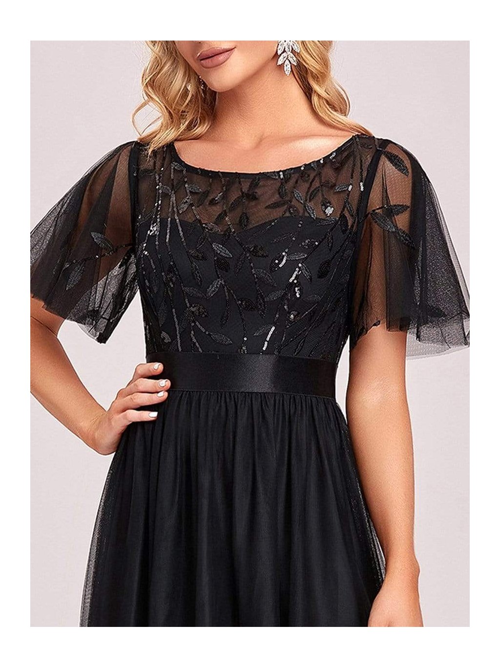 Šaty mají krátké volné rukávky. Na prsou i zádech je lodičkový výstřih. Vrchní díl je vyšívaný listy. Šatičky mají skrytý zip na zádech a nemají vycpávky.