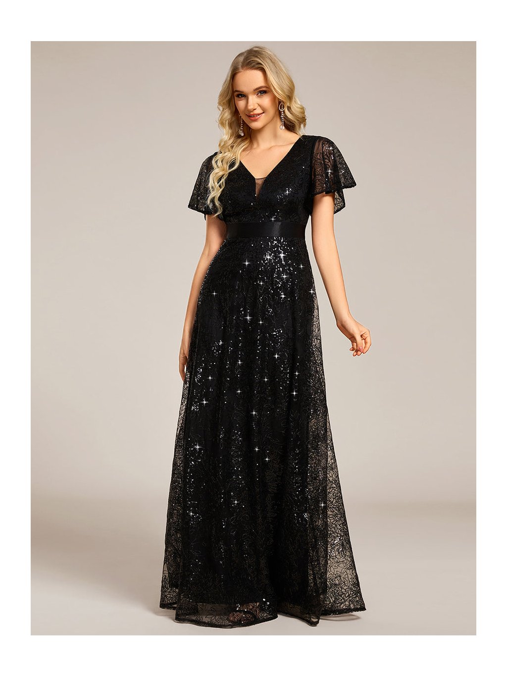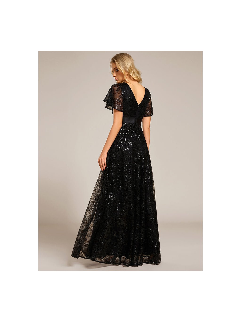 Luxusní dlouhé šaty Ever Pretty. Šaty mají na prsou a v zadu véčkový výstřih. Mají průhledné krátké a volné rukávky s odlesky. Na zádech mají skrytý zip. Sukně je velmi bohatá. Šaty krásně padnou a dělají velmi pěknou postavu.