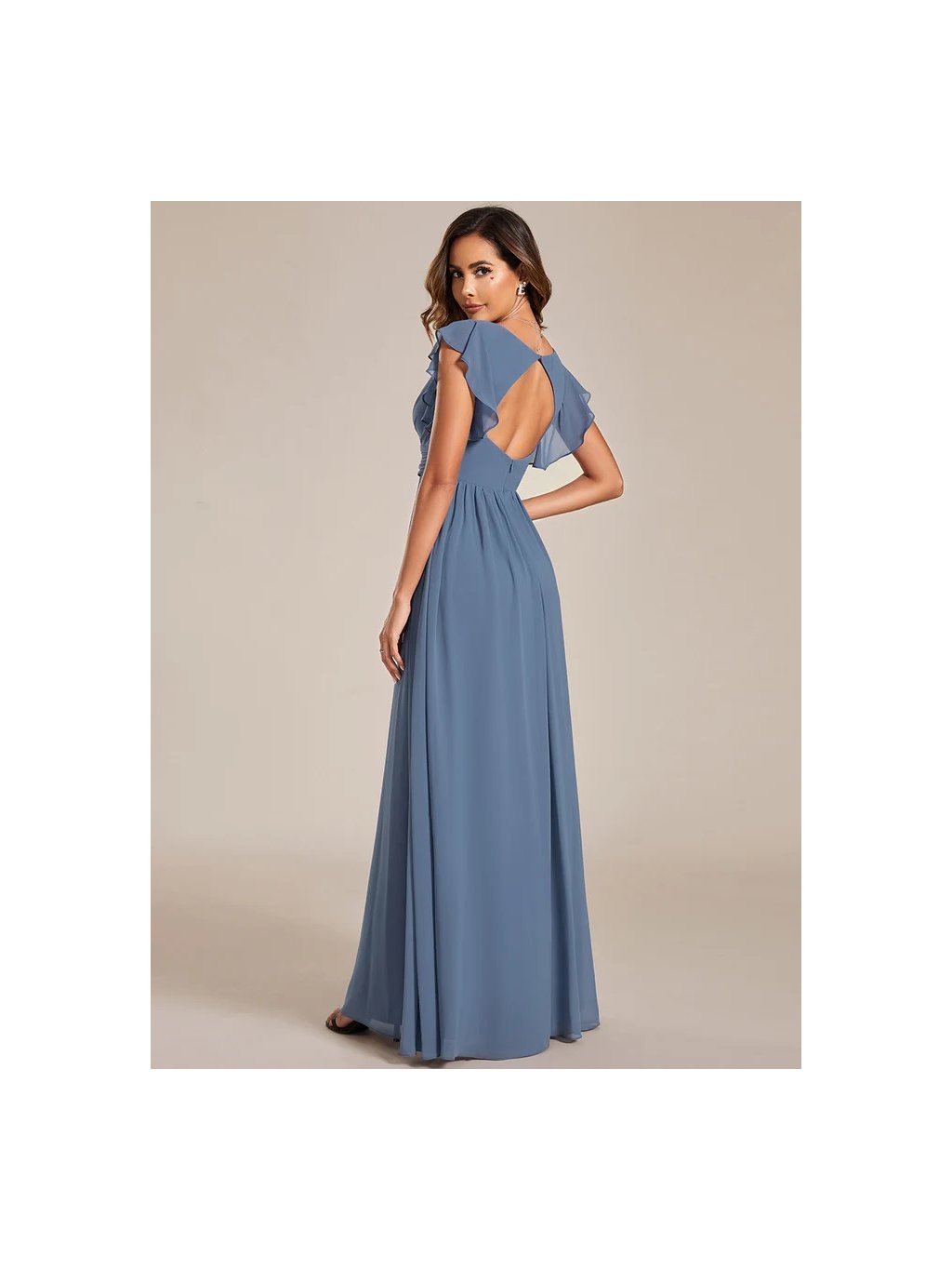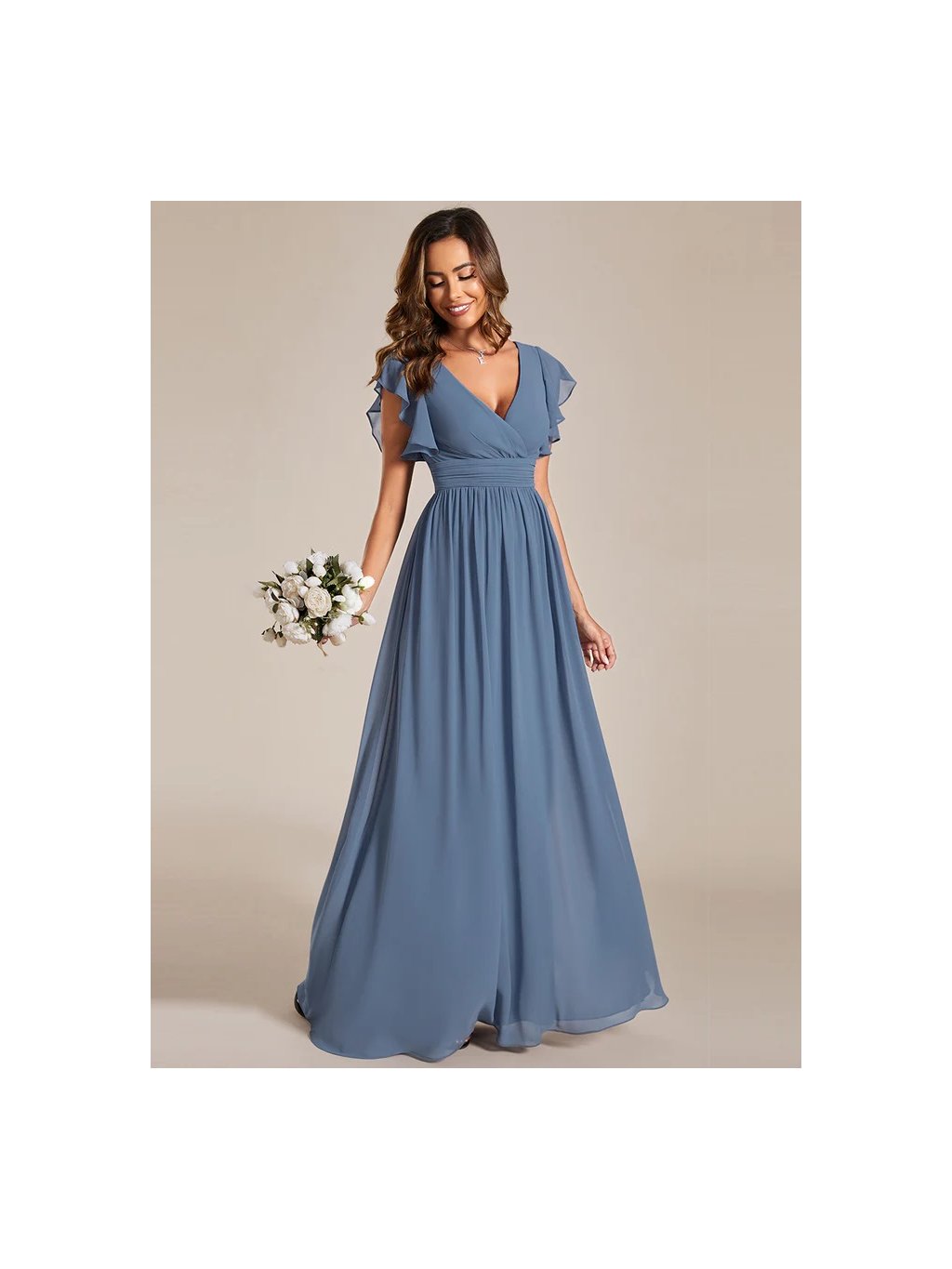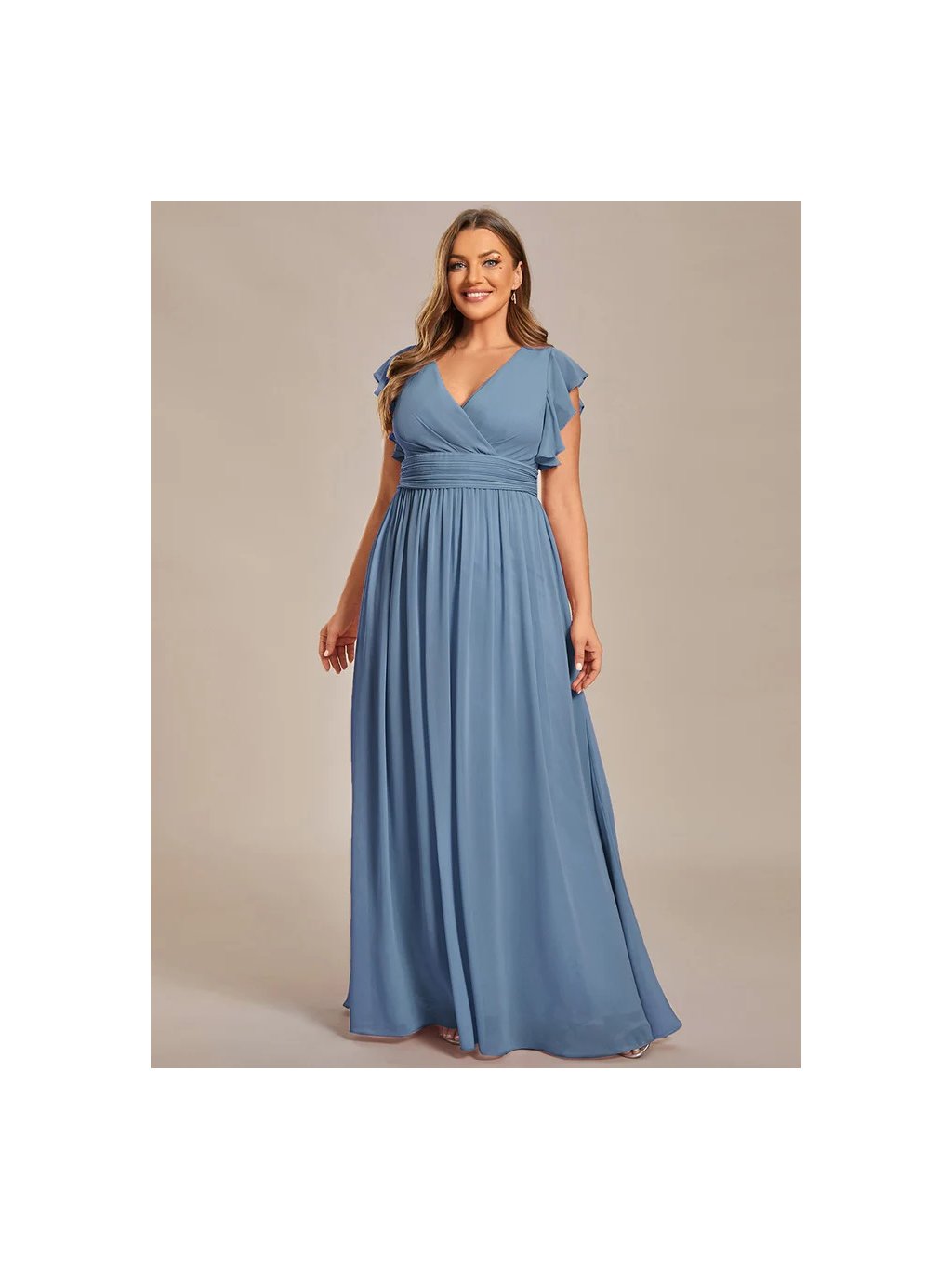 Šaty mají krátké volné rukávky volánkové. Na prsou je véčkový výstřih. Šatičky mají skrytý zip na zádech a vykrojení .Šatičky jsou lehké a krásně se přizpůsobí Vaší postavě.