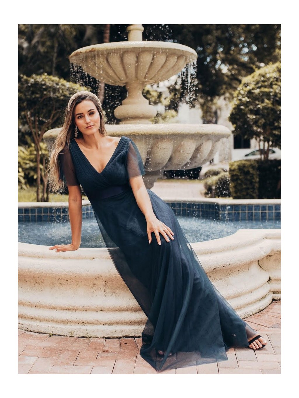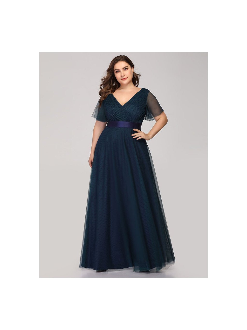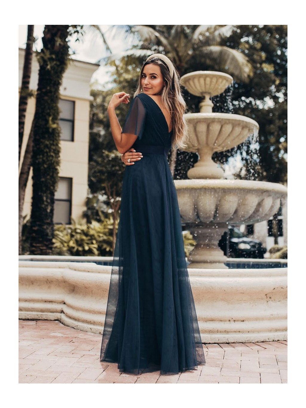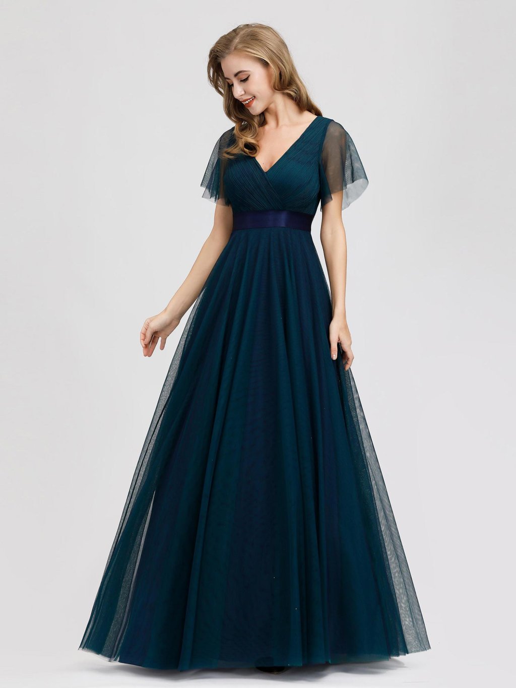 Luxusní dlouhé šaty Ever Pretty. Šaty mají na prsou i zádech hluboký véčkový výstřih. Mají průhledné krátké a volné rukávky. Na zádech mají skrytý zip. Sukně je velmi bohatá. Šaty krásně padnou a dělají velmi pěknou postavu.