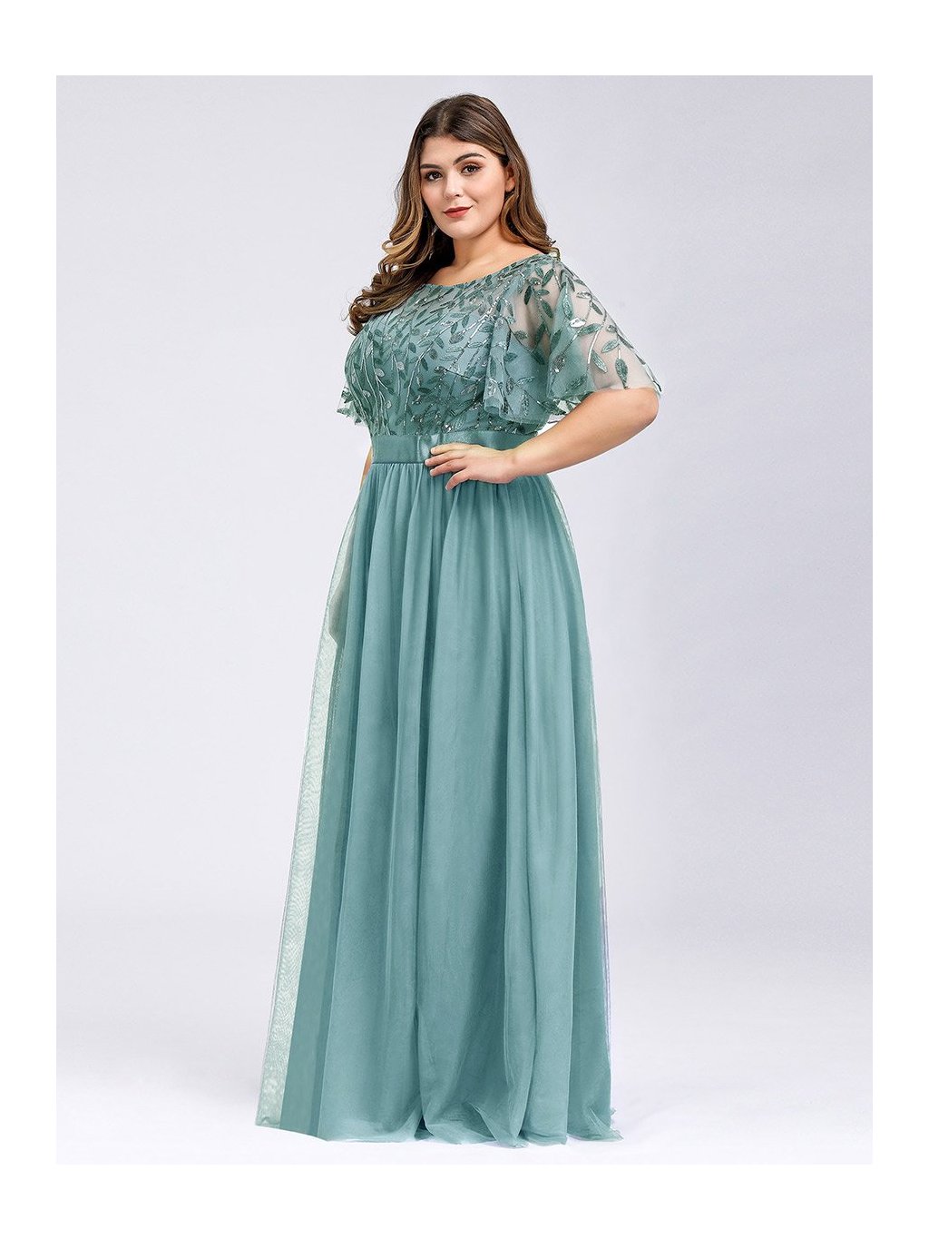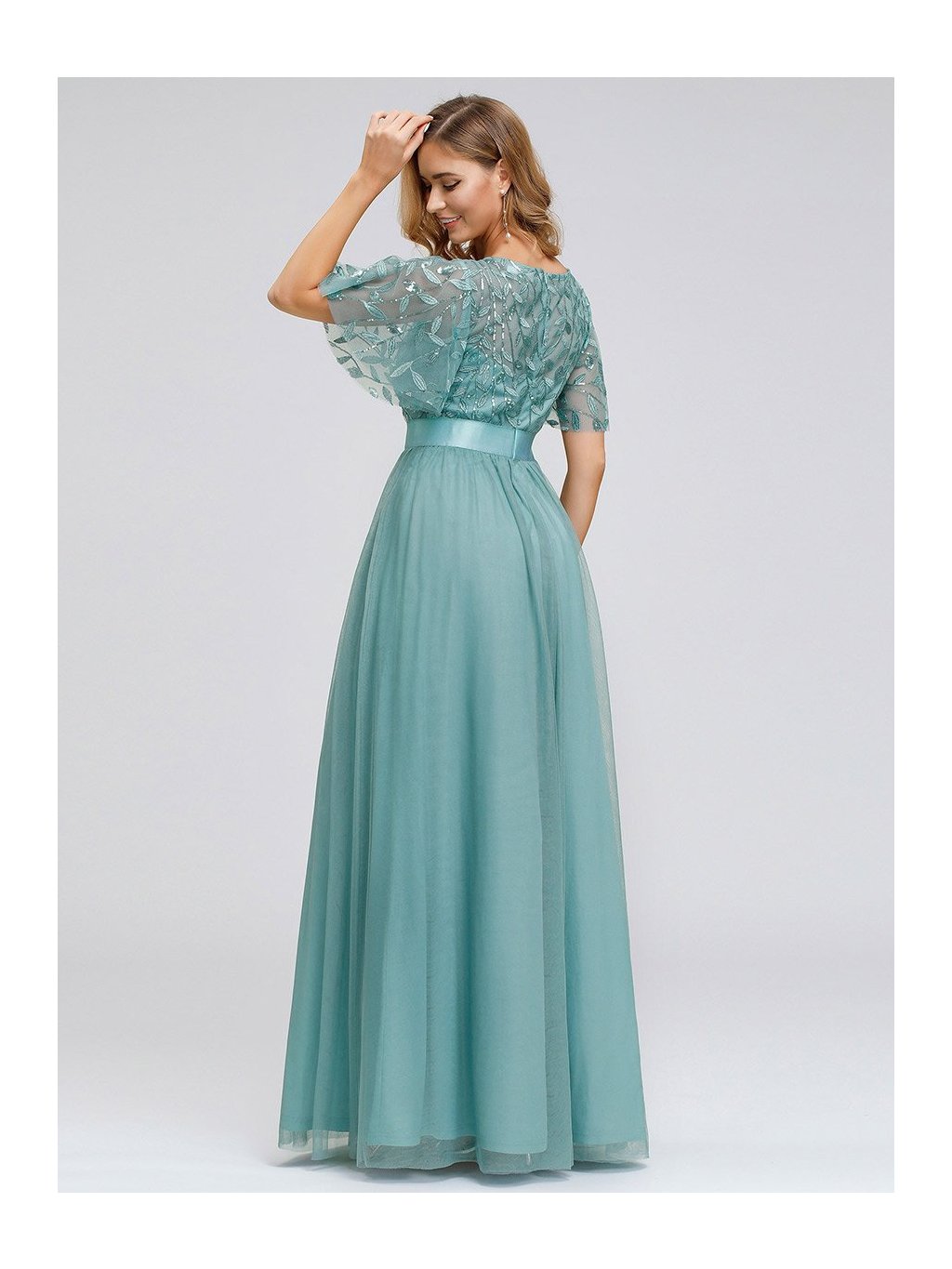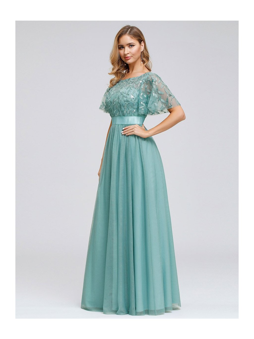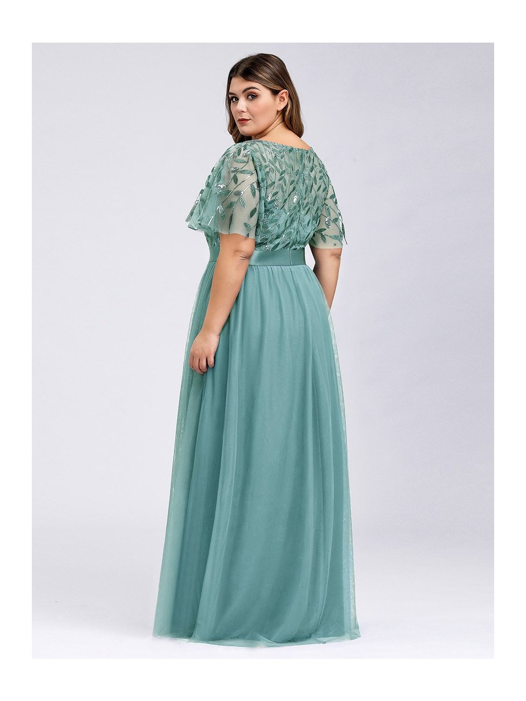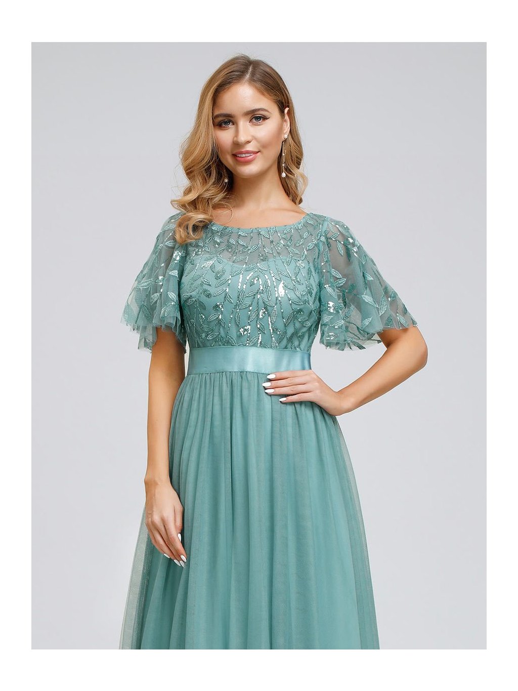 Šaty mají krátké volné rukávky. Na prsou i zádech je lodičkový výstřih. Vrchní díl je vyšívaný listy. Šatičky mají skrytý zip na zádech a nemají vycpávky.