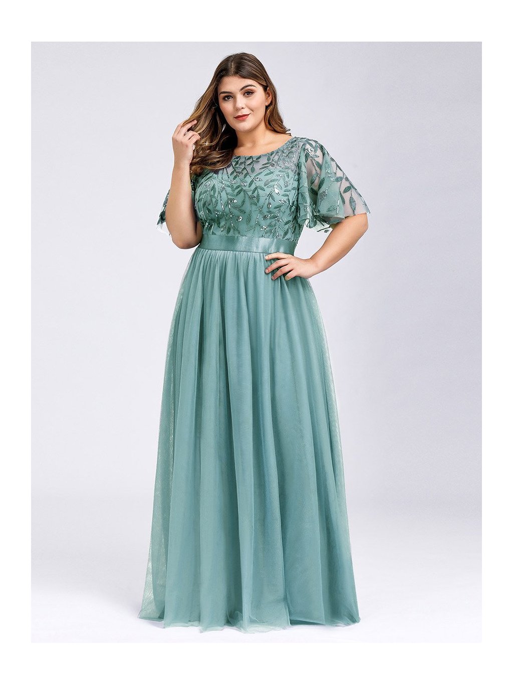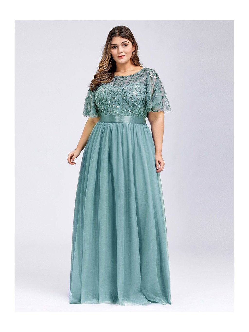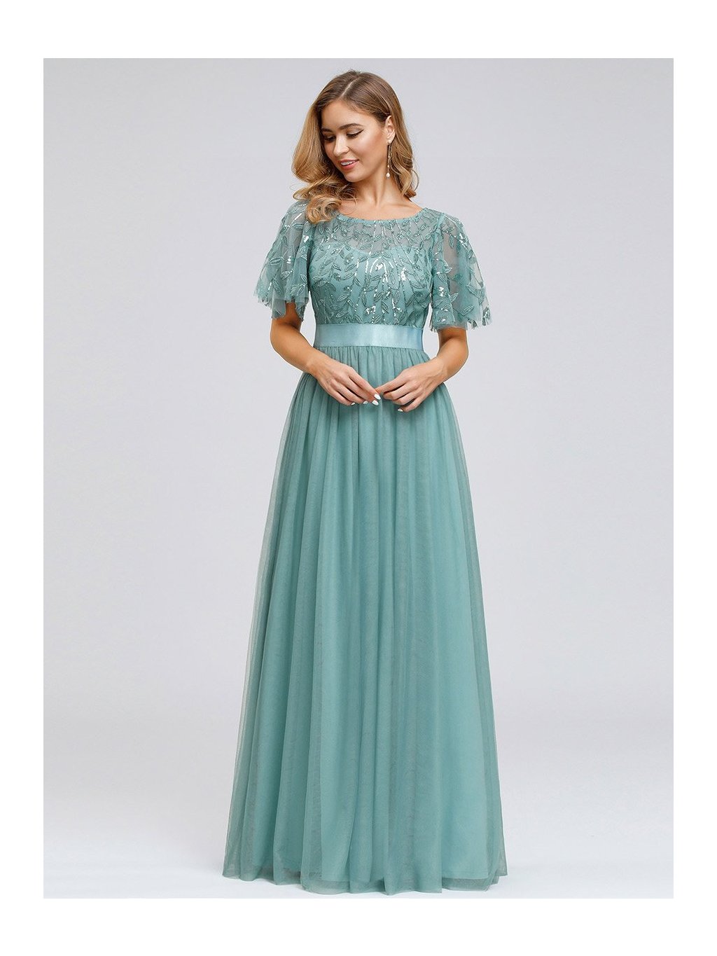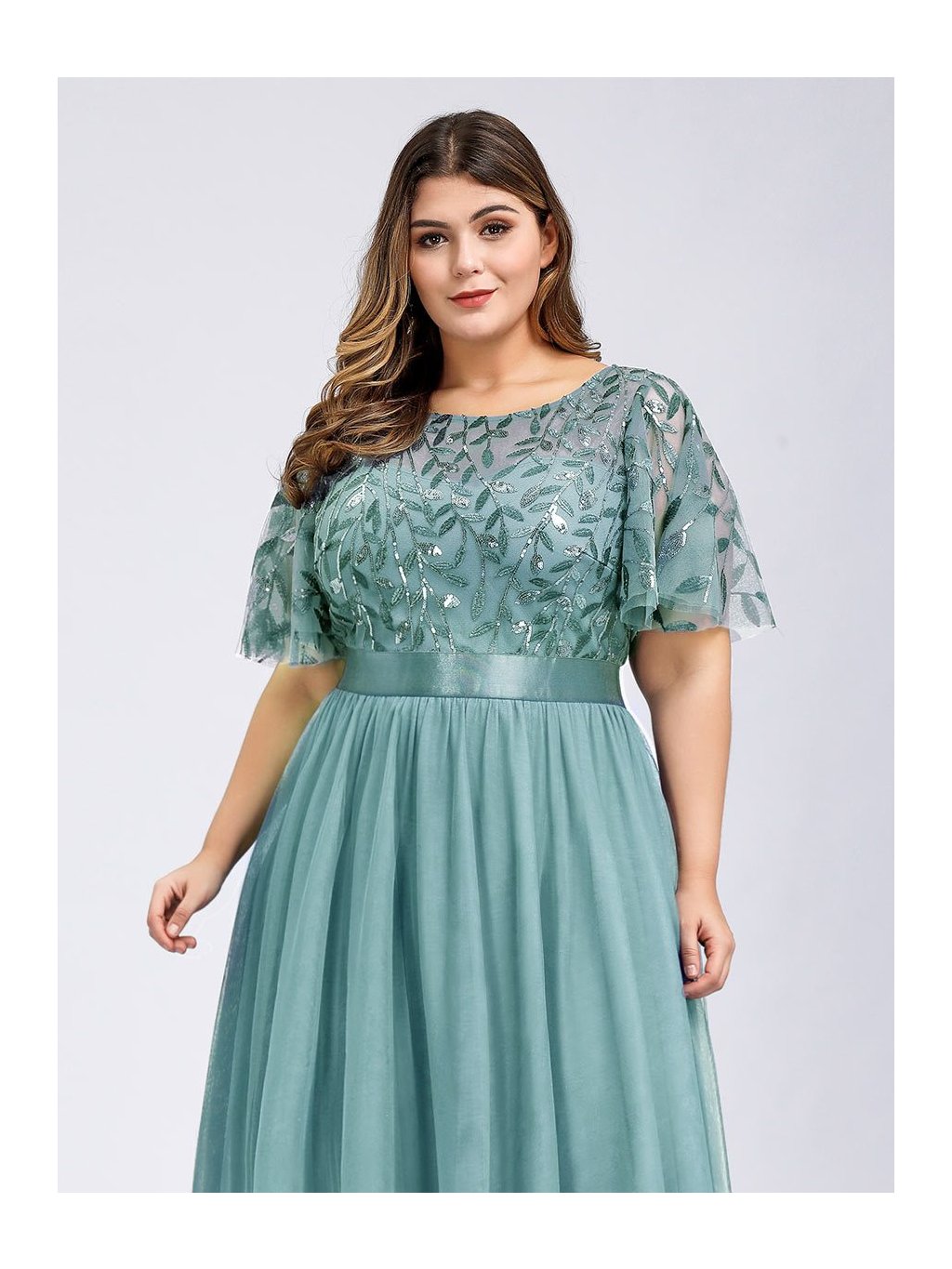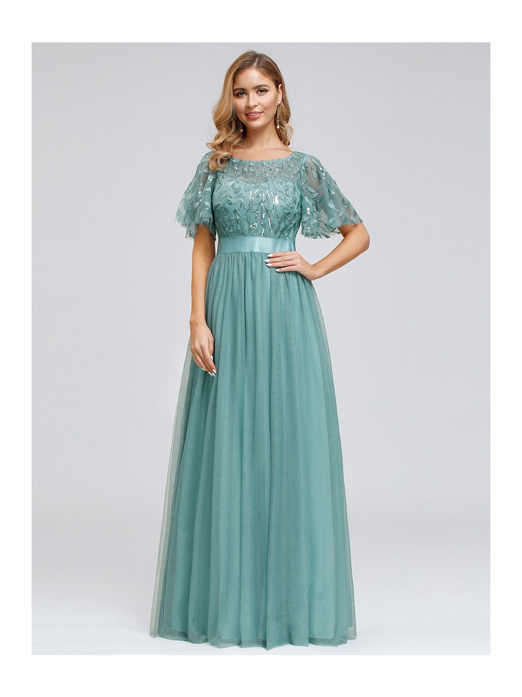 Šaty mají krátké volné rukávky. Na prsou i zádech je lodičkový výstřih. Vrchní díl je vyšívaný listy. Šatičky mají skrytý zip na zádech a nemají vycpávky.
