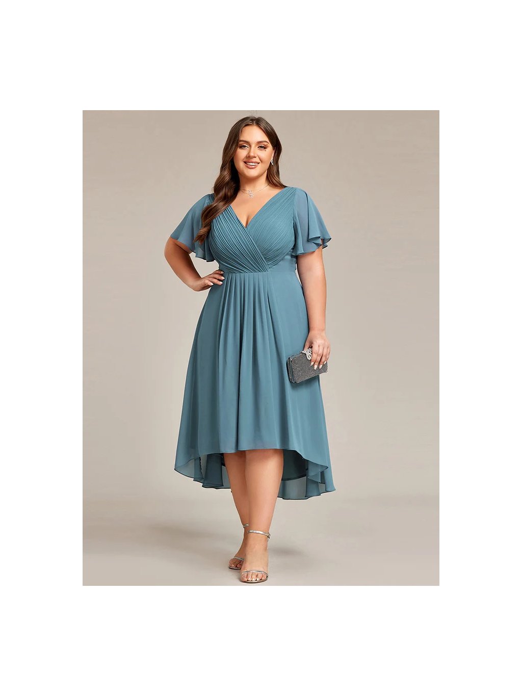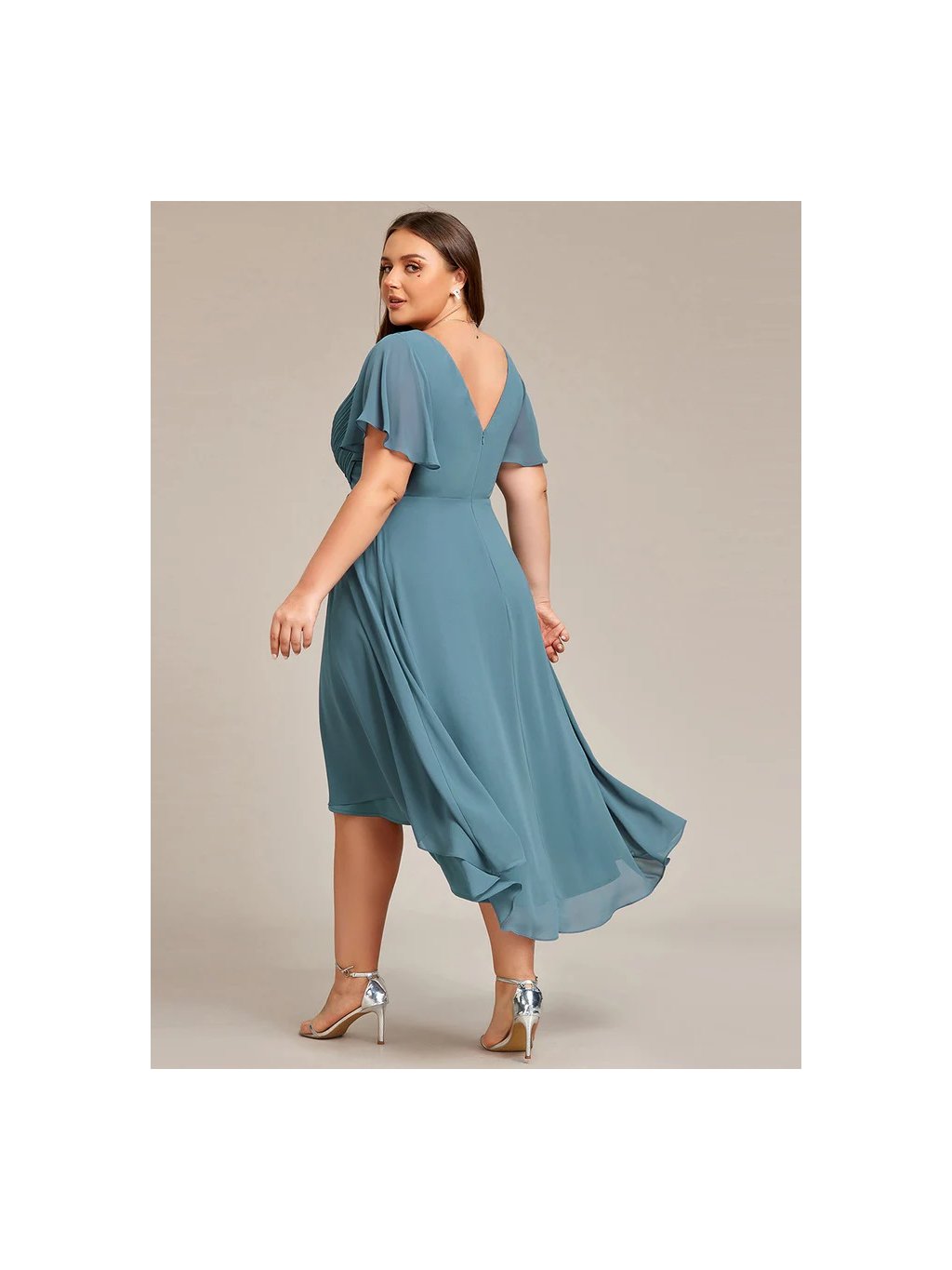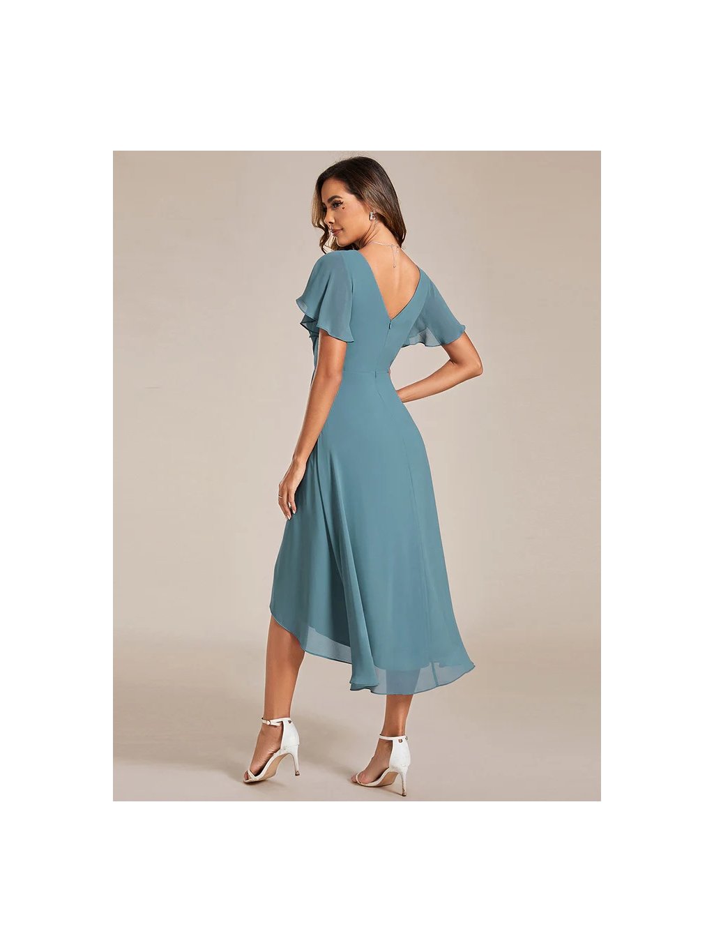 Jemné šifonové šaty s krátkými rukávy, dokonalý jednoduchý design. Šaty mají midi délku a asymetrickou sukni, ideální pro svatební hosty či družičky.