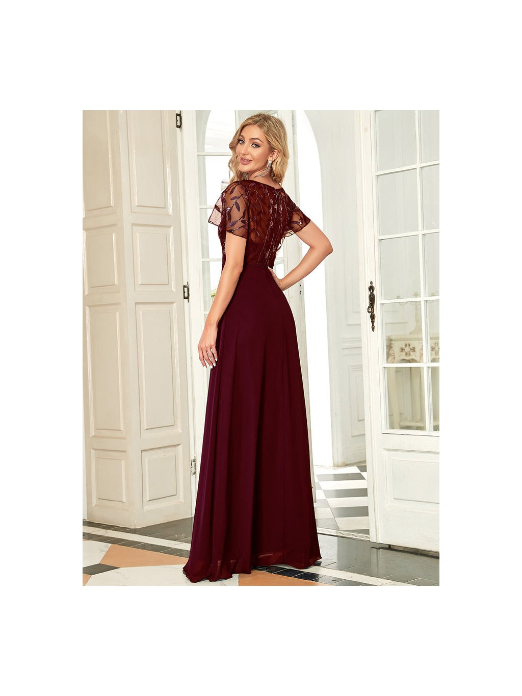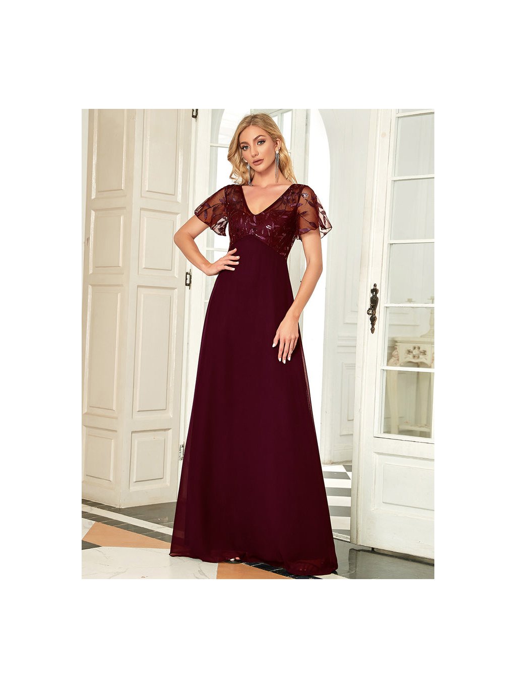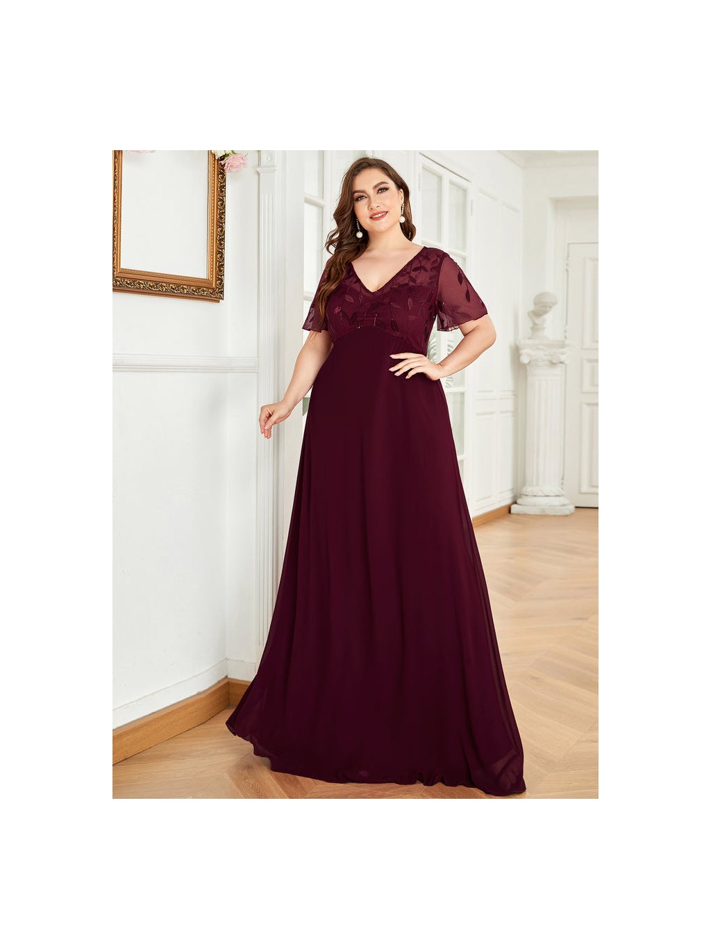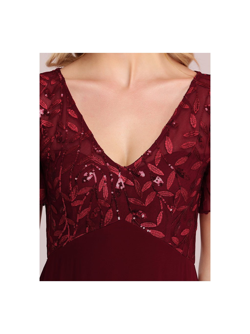 Nádherné tmavě červené šaty Ever Pretty. Dlouhé šaty na široká ramínka a s krátkým rukávkem. Rukávky jsou volné a vyšívané listy. Na prsou mají šaty velký výstřih. Na zádech skrytý zip.