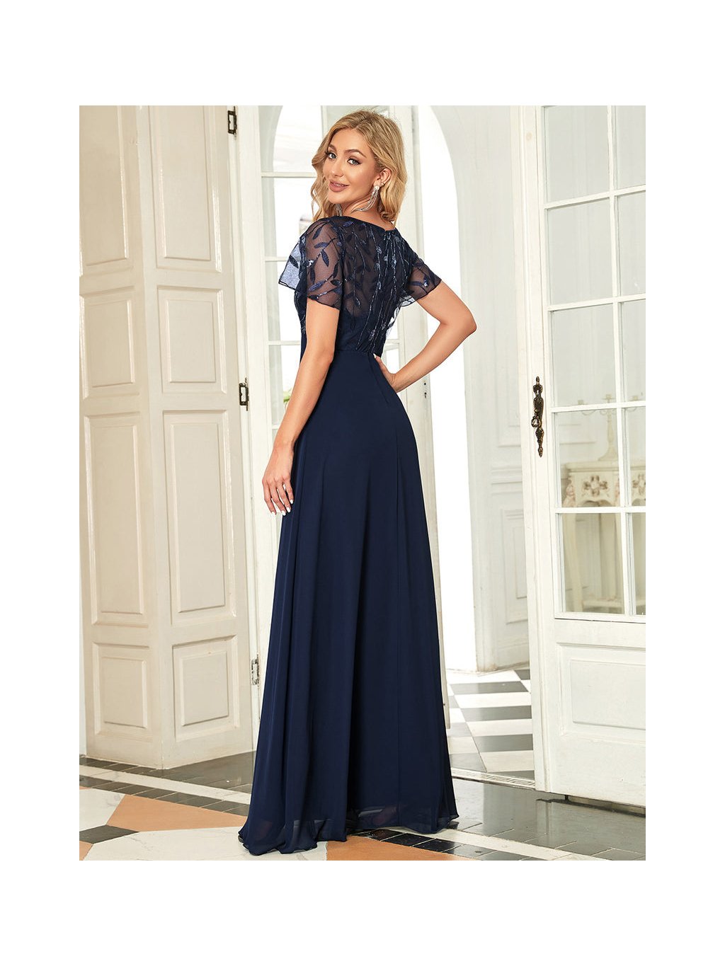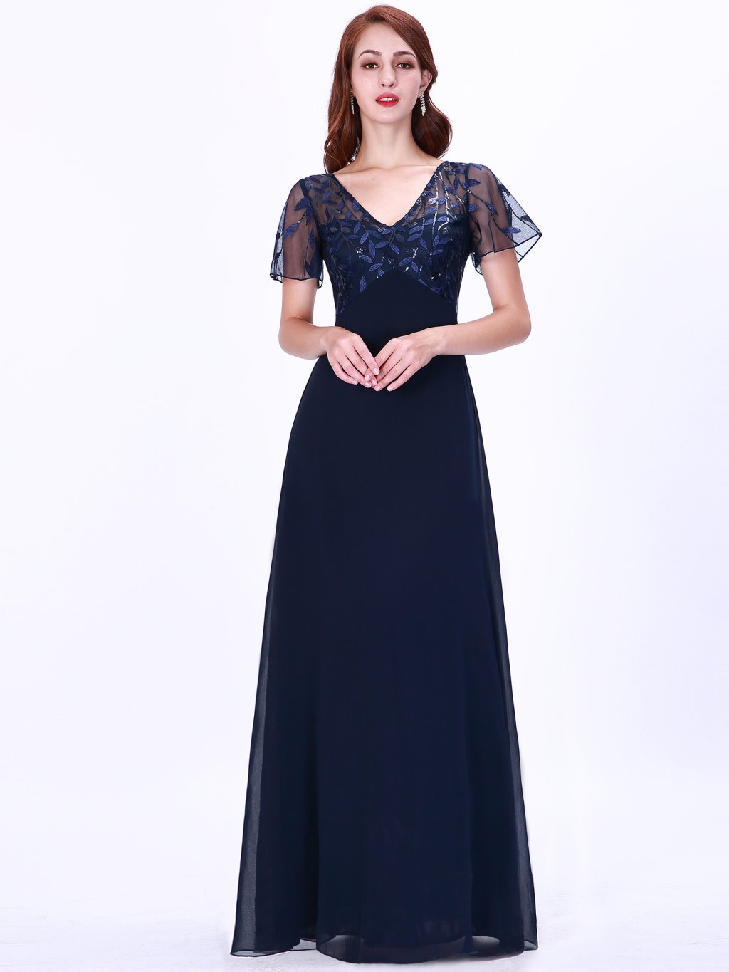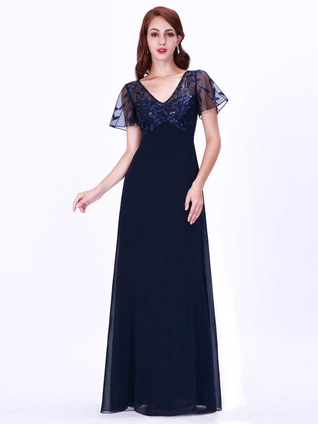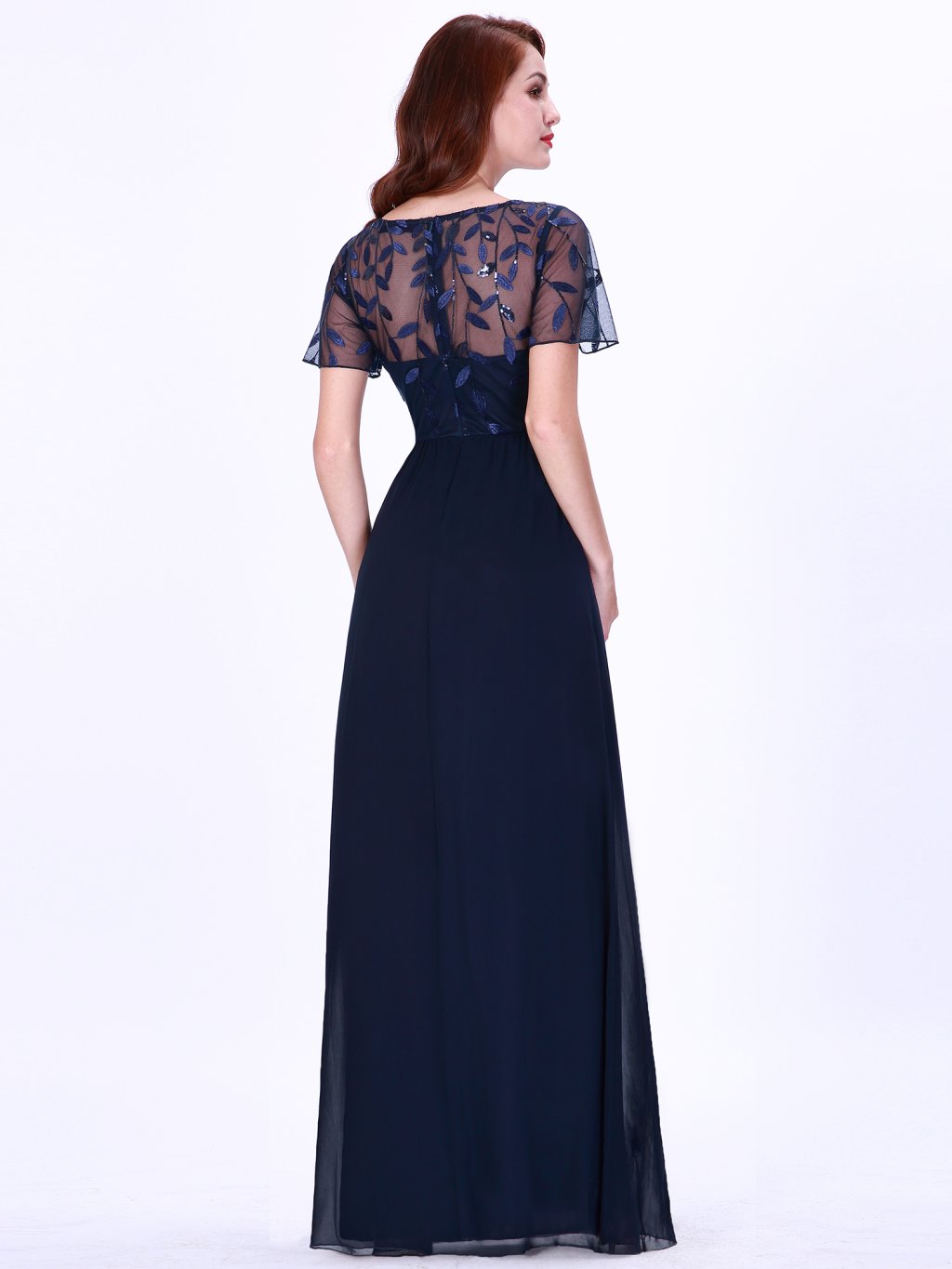 Nádherné tmavě modré šaty Ever Pretty. Dlouhé šaty na široká ramínka a s krátkým rukávkem. Rukávky jsou volné a vyšívané listy. Na prsou mají šaty velký výstřih. Na zádech skrytý zip.