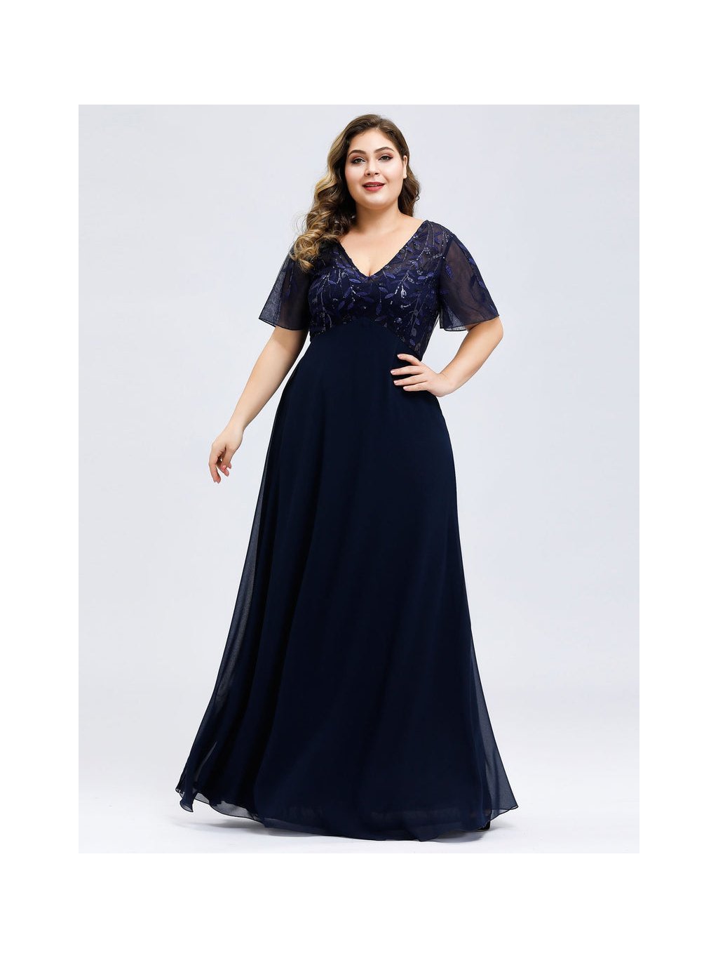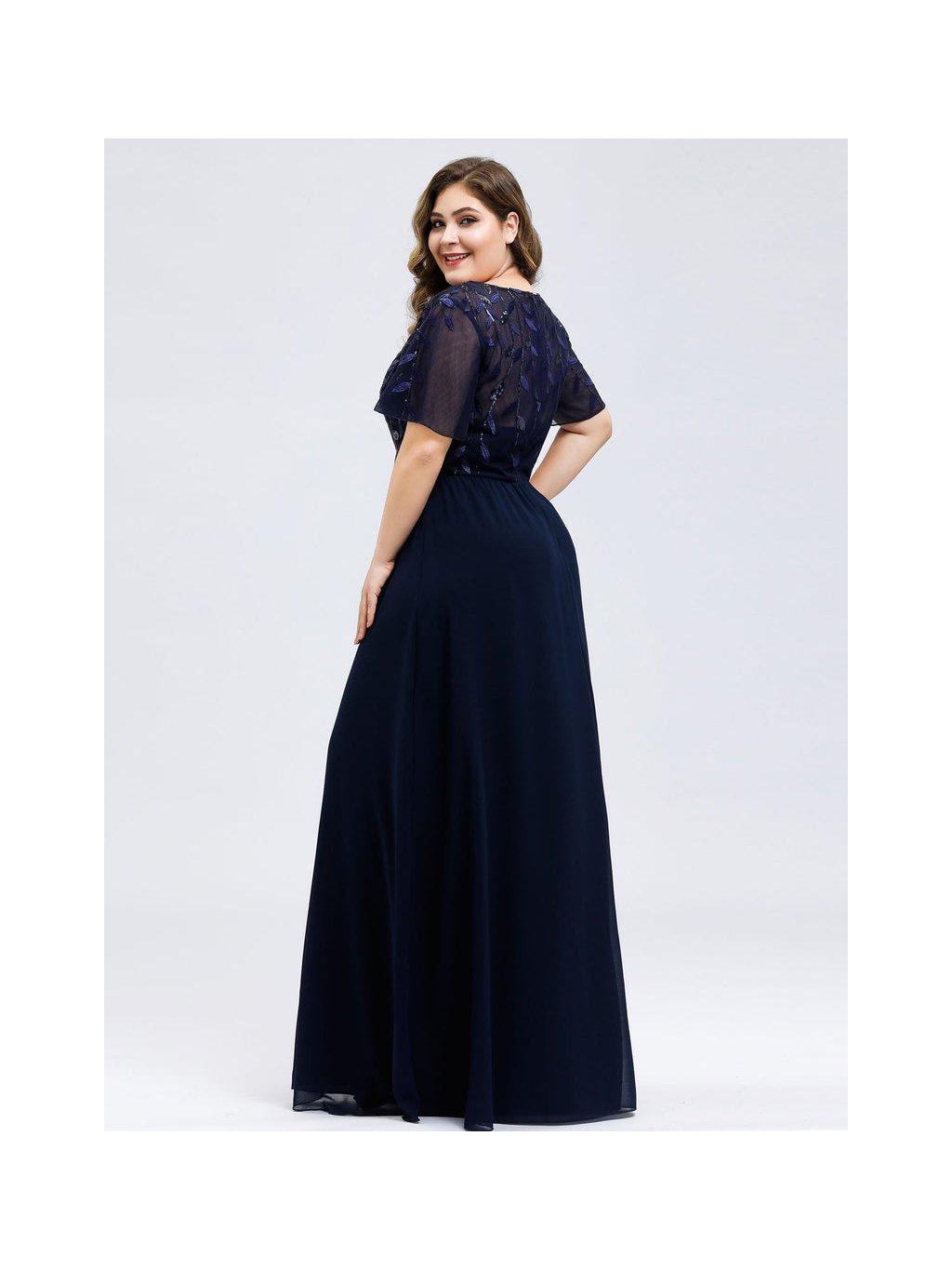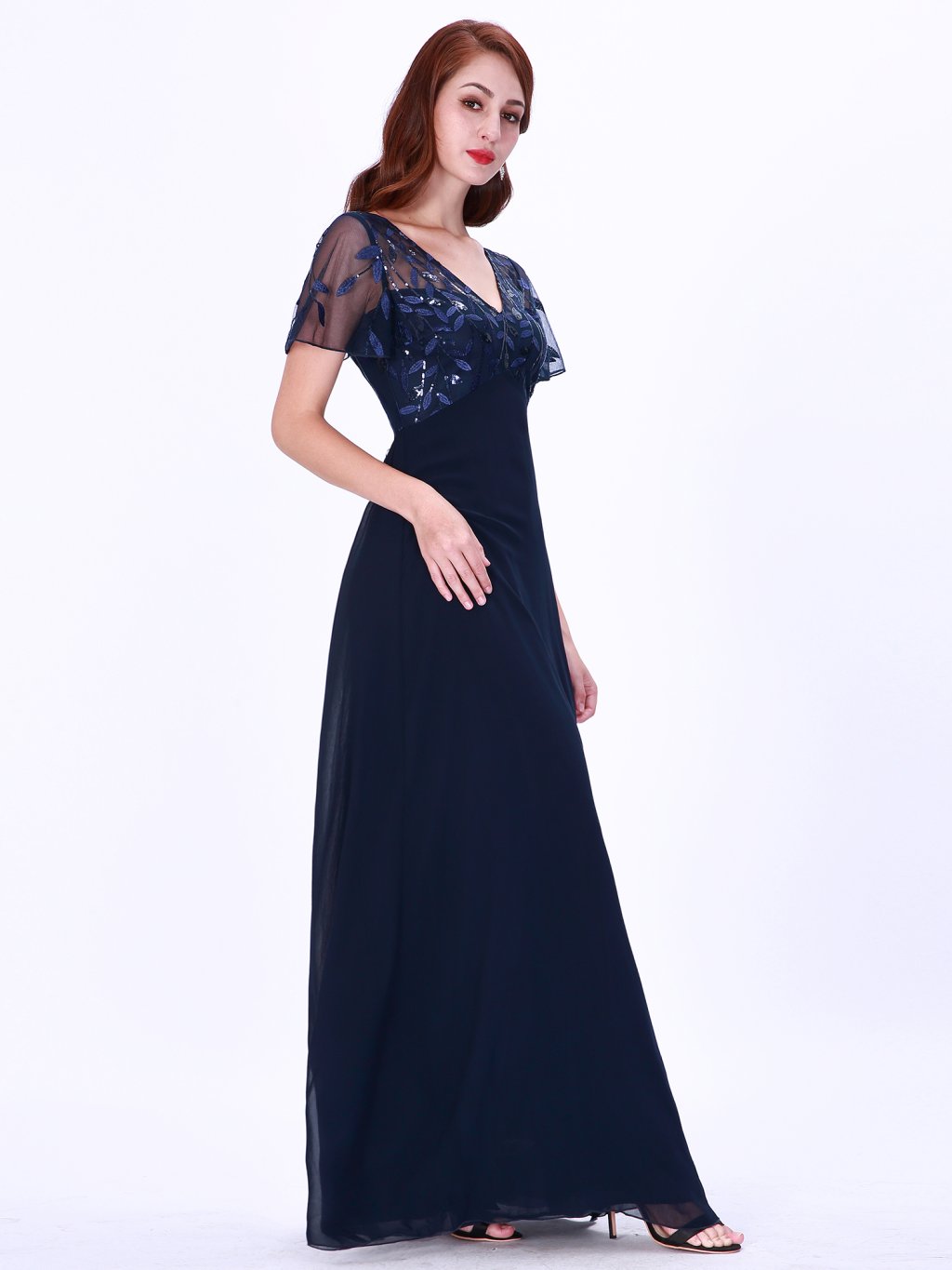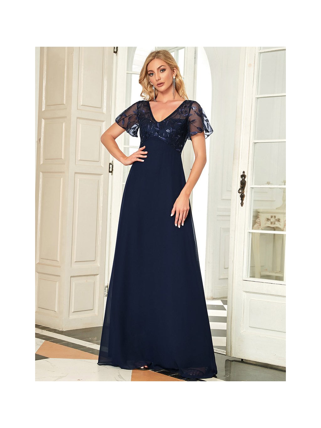 Nádherné tmavě modré šaty Ever Pretty. Dlouhé šaty na široká ramínka a s krátkým rukávkem. Rukávky jsou volné a vyšívané listy. Na prsou mají šaty velký výstřih. Na zádech skrytý zip.