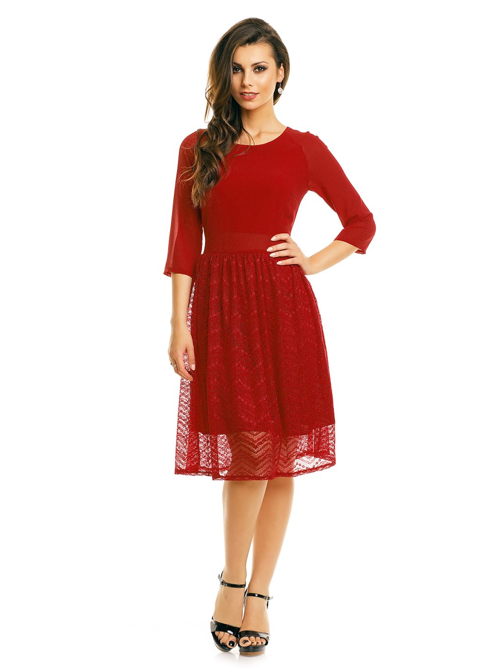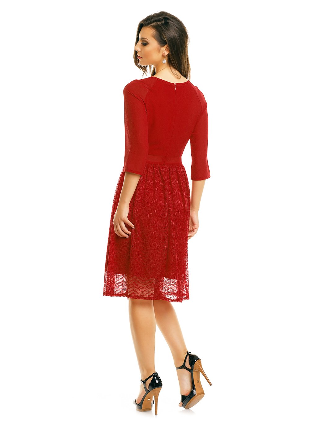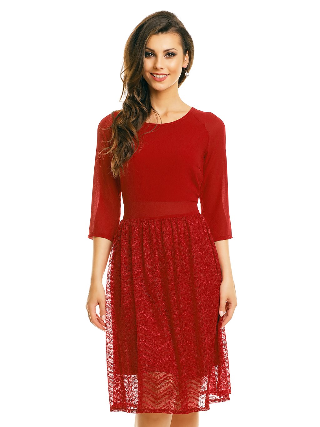 Velmi příjemný, jemný materiál, krásně se nosí. Šaty mají tříčtvrteční rukávy, mají lodičkový výstřih. Sukně má krátkou černou spodničku, přes který je delší krajkovaná sukně. Na zádech mají skrytý zip.