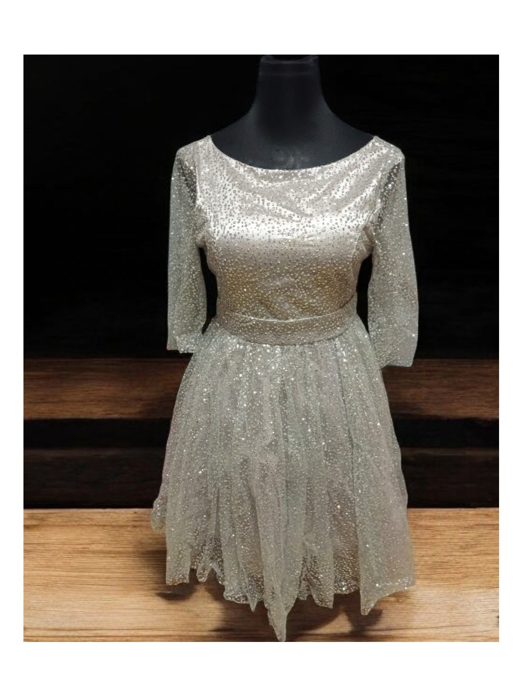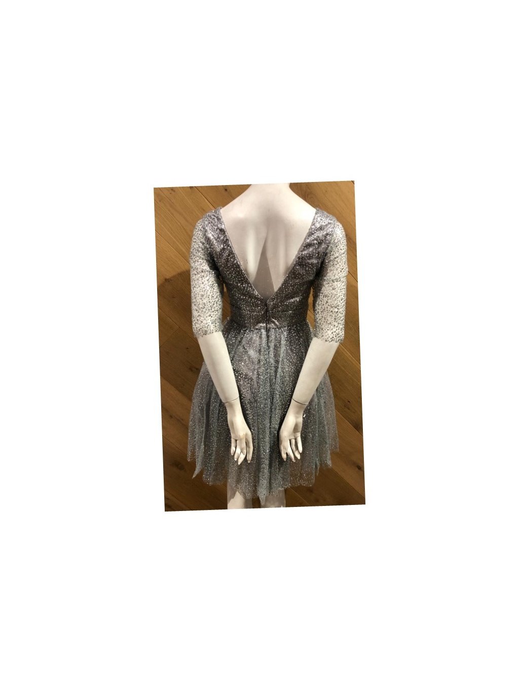 Luxusní společenské krátké šaty s lodičkovým výstřihem a vzadu s hlubokým véčkovým výstřihem na zip. Na prsou mají výstuhy.