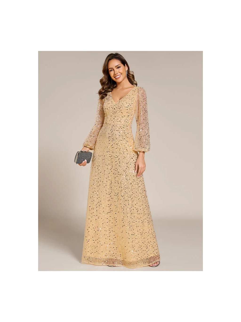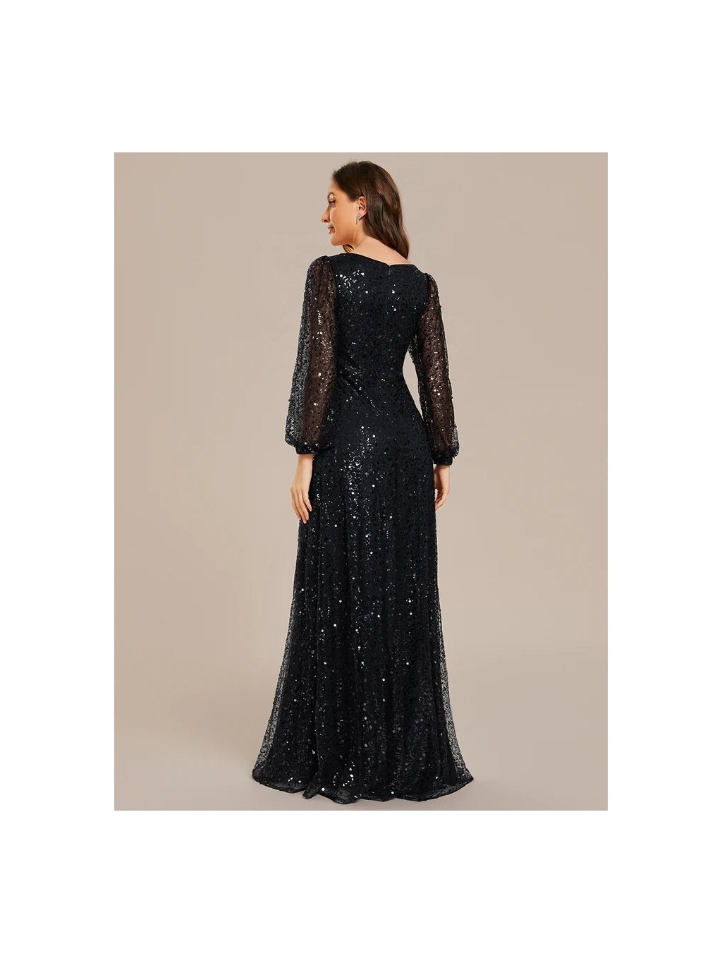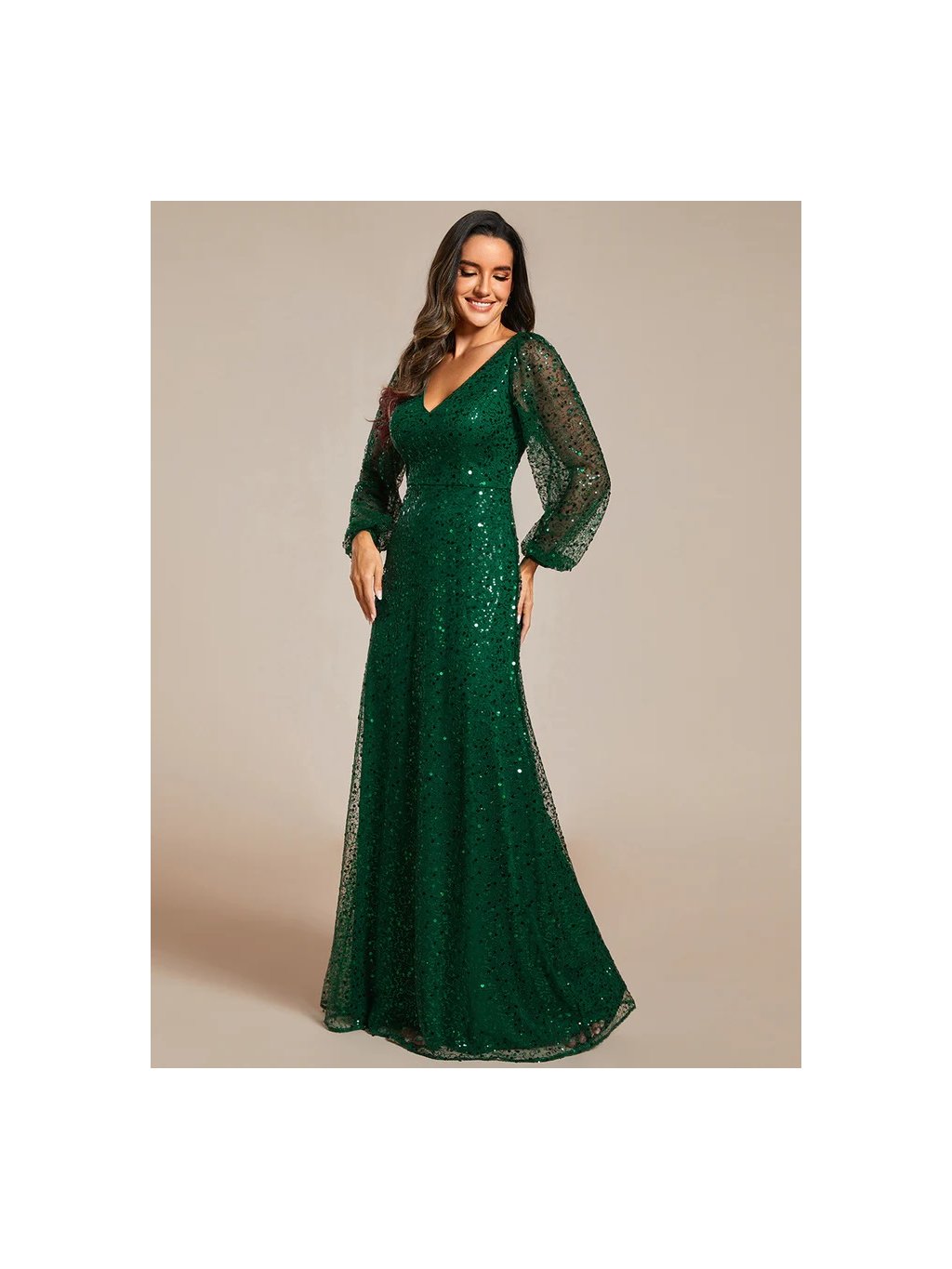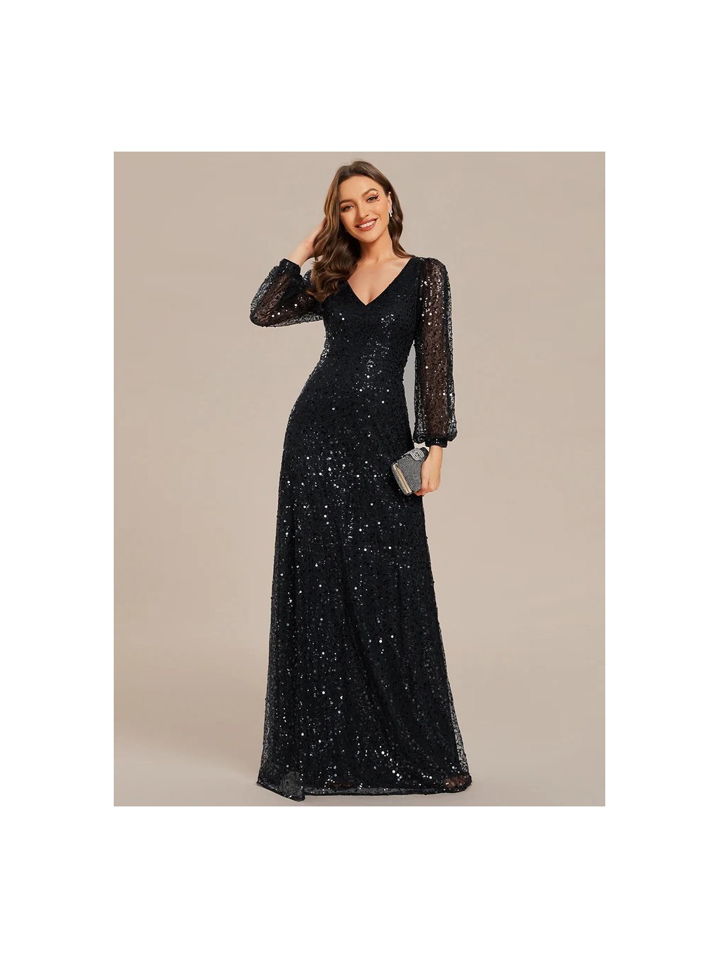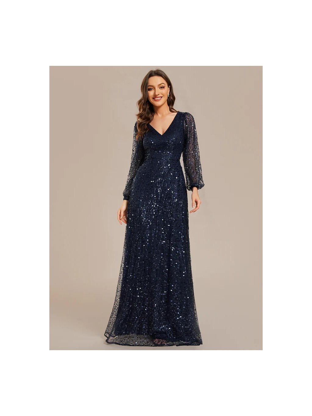 Úchvatné plesové šaty Ever Pretty. Šaty mají dlouhé rukávy. Na prsou véčkový výstřih. Šaty s flitry