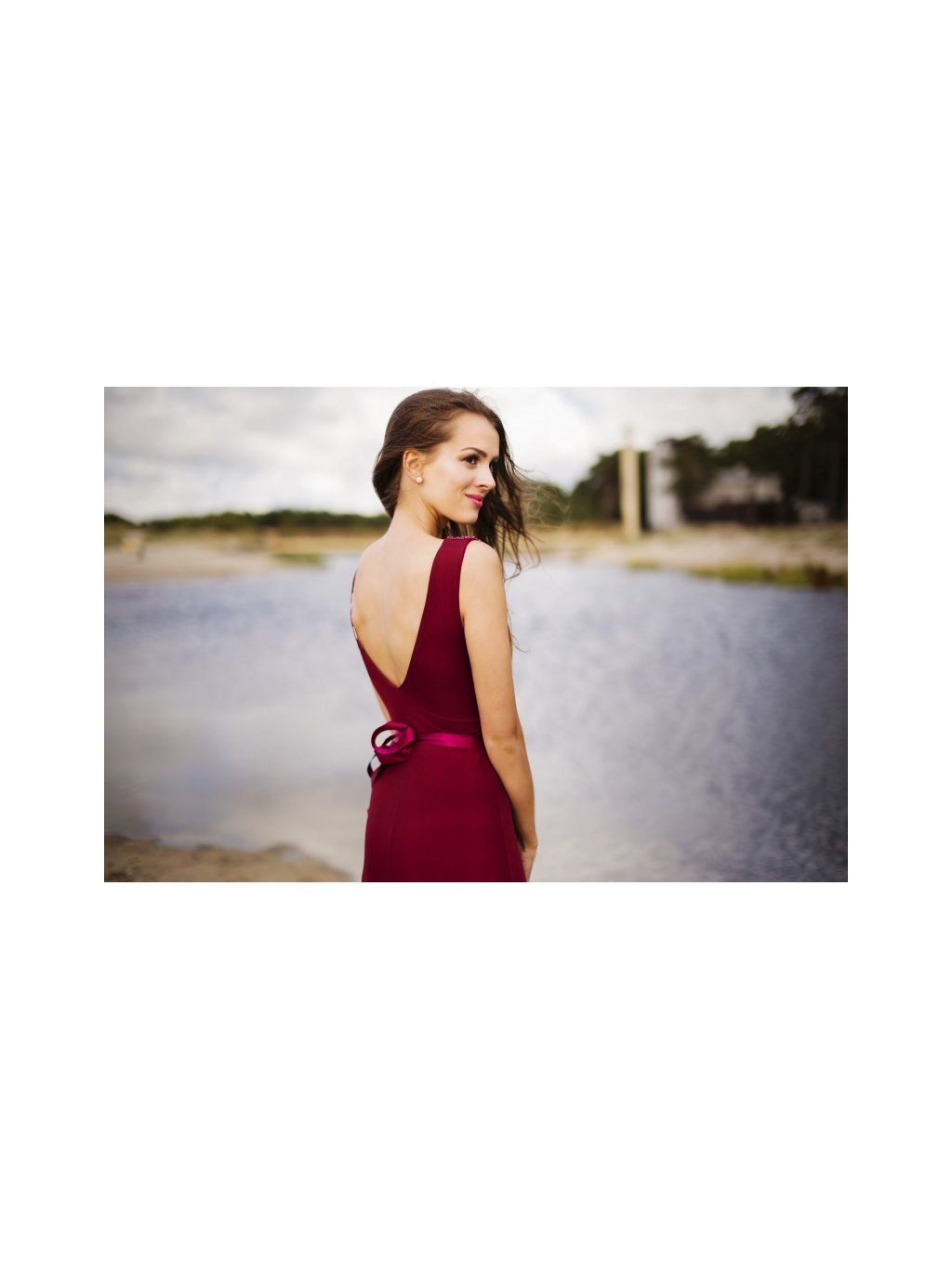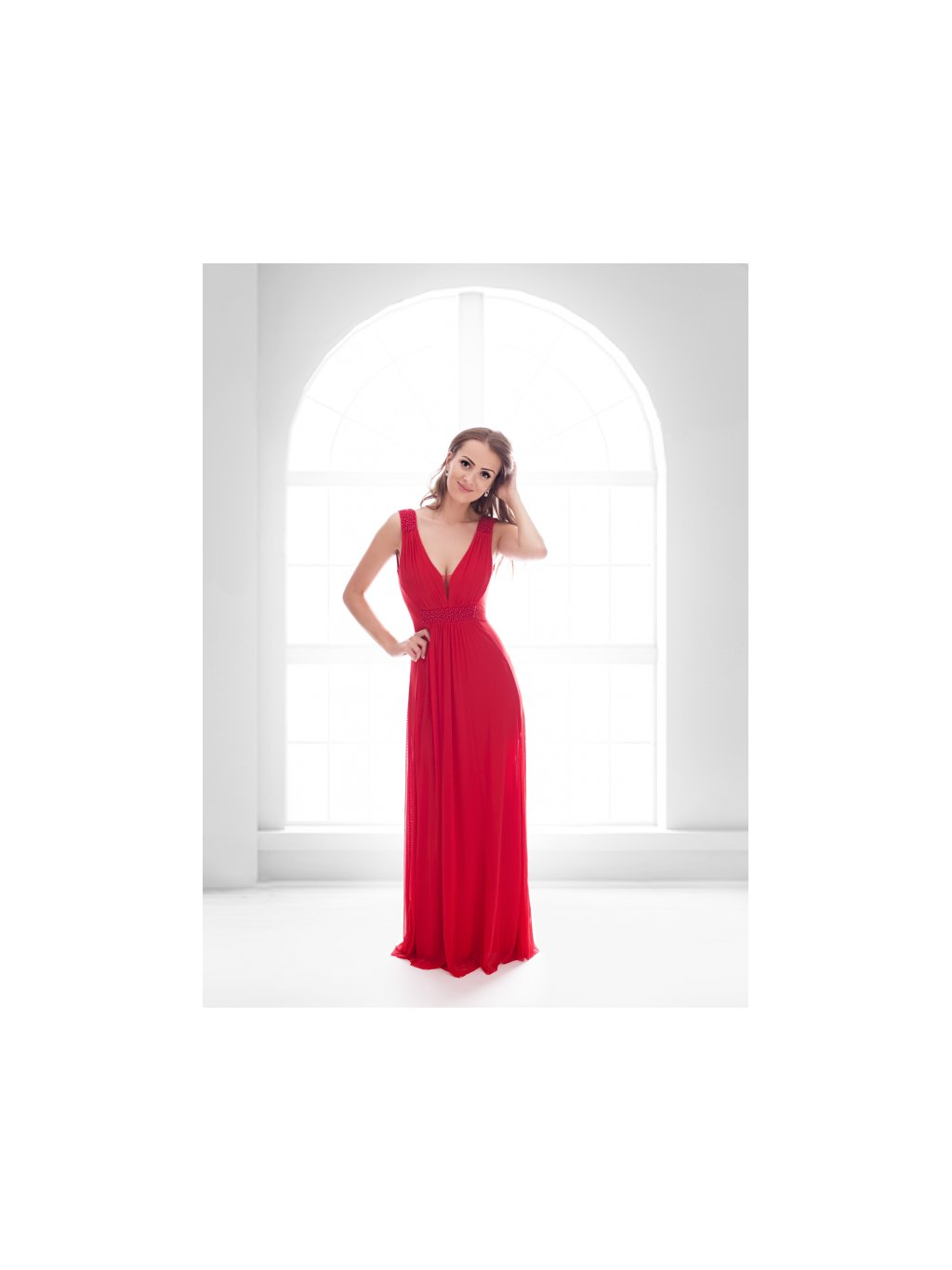 Stylové šaty s hlubokým výstřihem, zdobené v pase a na ramenou korálky stejné barvy. Vzadu hluboký V výstřih, na zip a na uvázání mašle.