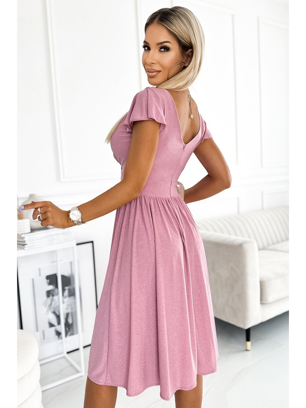 Rozšířené šaty s obálkovým výstřihem a krátkými rukávy. Jsou vyrobeny z pružné lesklé látky ve špinavě růžové barvě. Značka numoco. Polský výrobek.