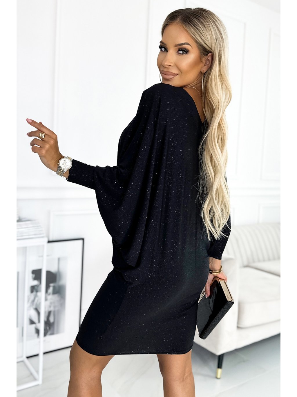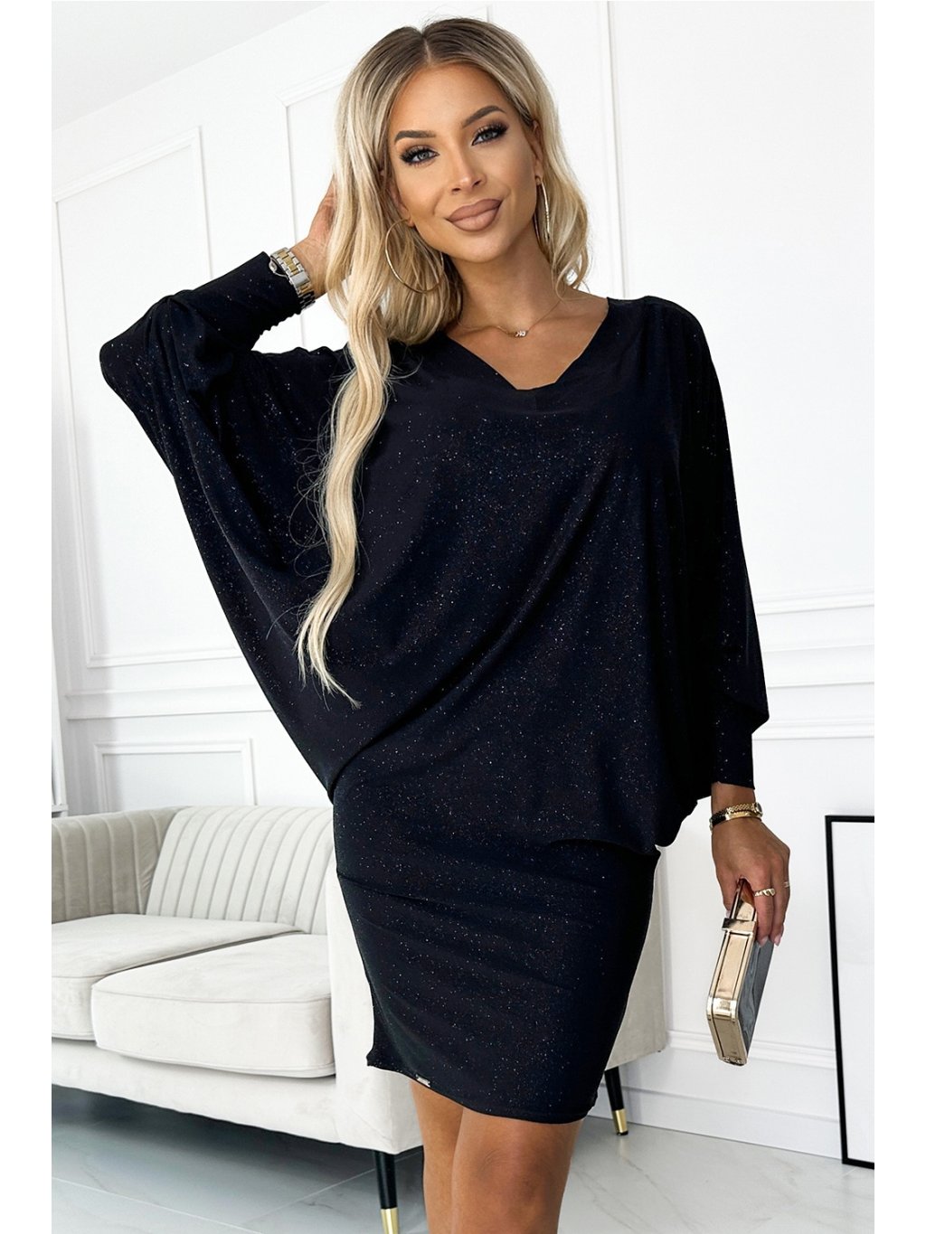 Netopýří šaty s výstřihem. Vyrobeno z elastické látky se třpytkami. Lze nosit rovně nebo volně. Šaty v černé barvě s brokátem. Značka numoco. Polská výroba.