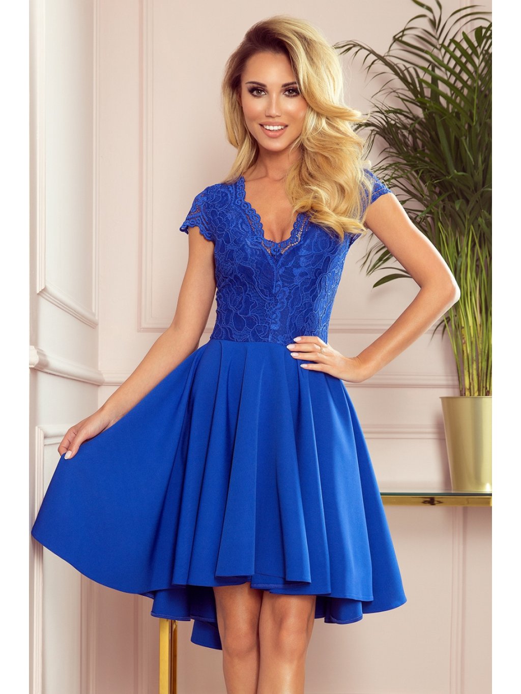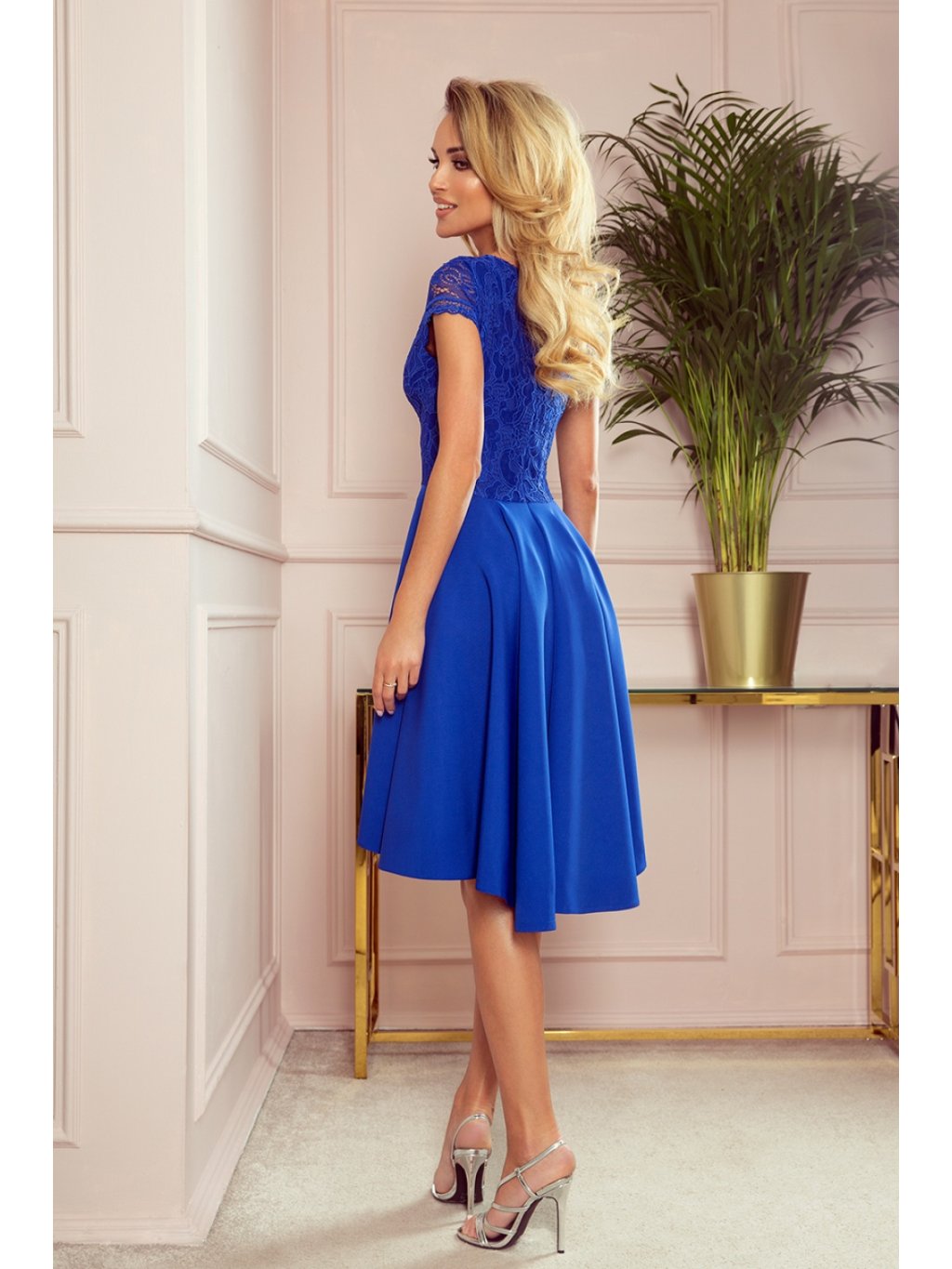Exkluzivní asymetrické šaty s delšími zády, krátkými rukávy, výstřihem a krajkou v chrpové barvě. Sukně s delším zadním dílem bude ideální pro tanec. Vyrobeno v Polsku. Značka Numoco.