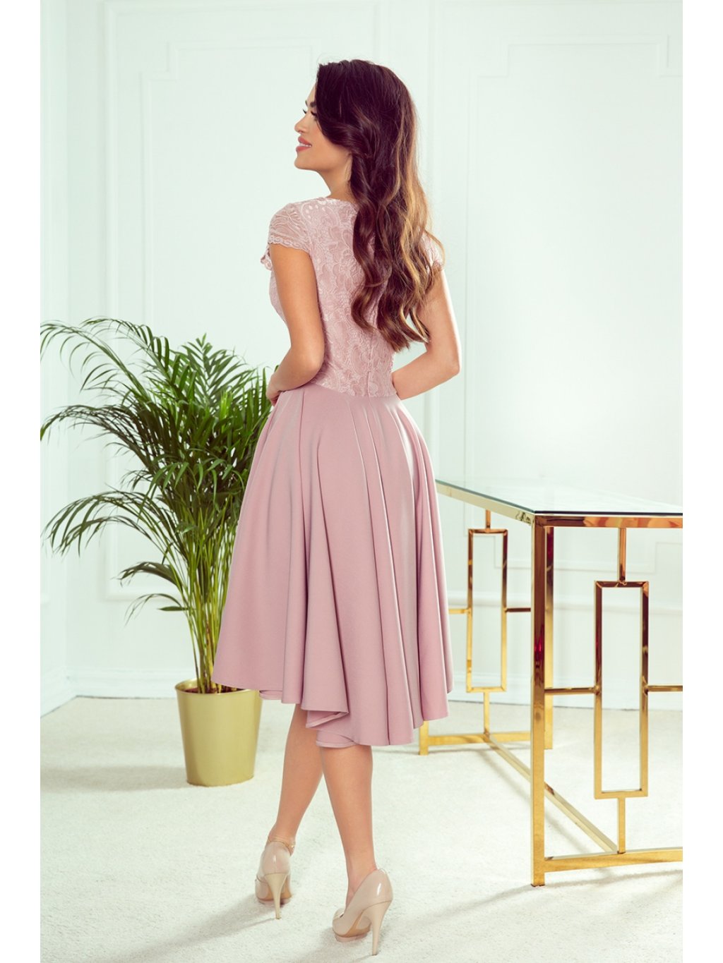Exkluzivní asymetrické šaty s delšími zády, krátkými rukávy, výstřihem a krajkou. Šaty v pudrově růžové barvě. Sukně s delšími zády bude ideální pro tanec. Vyrobeno v Polsku. Značka Numoco.
