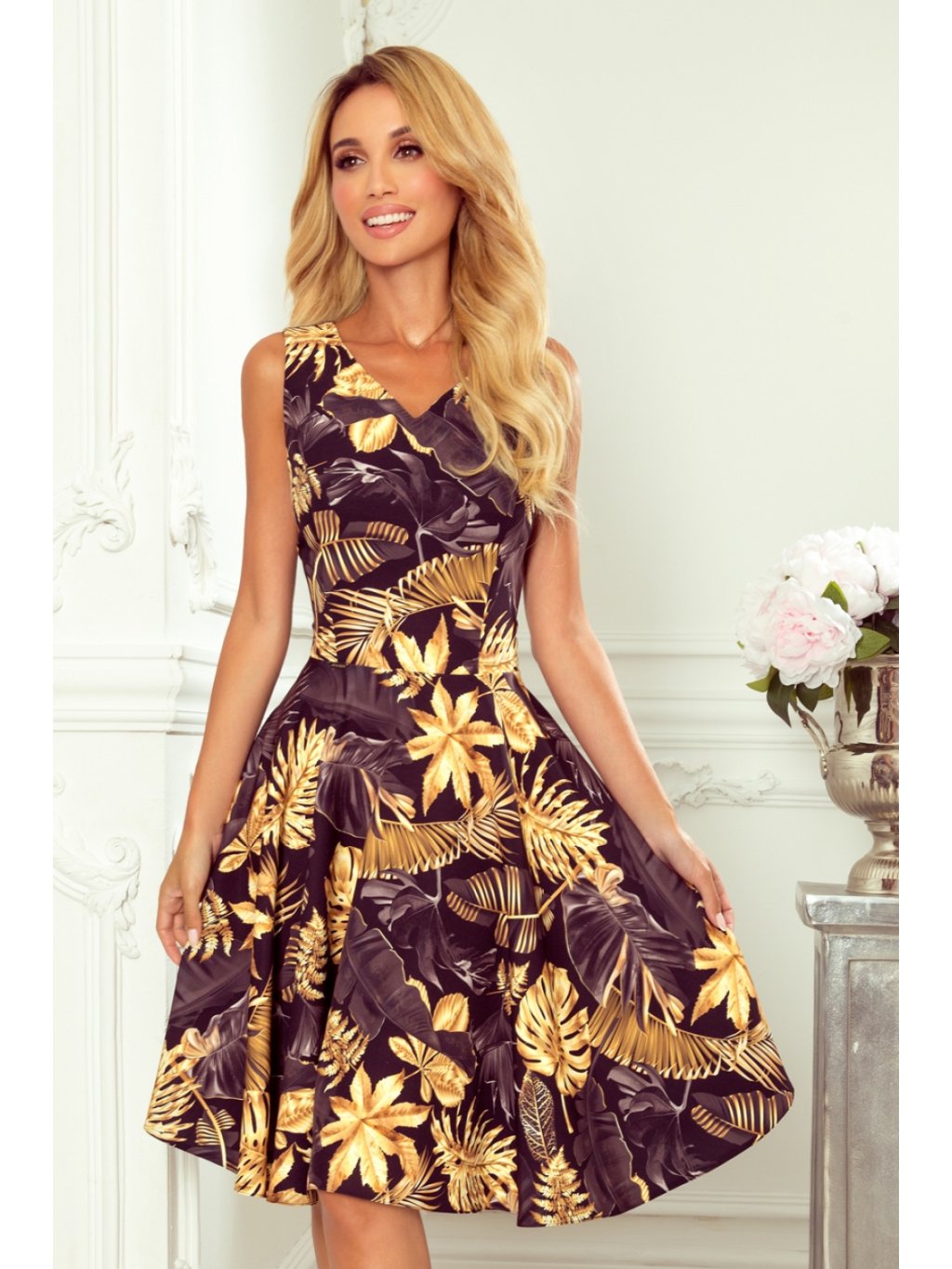 Rozšířené šaty s výstřihem ve tvaru srdce. Barva: černá se zlatými listy. Vysoce kvalitní tkanina s příjemným omakem. Značka numoco. Polský výrobek.